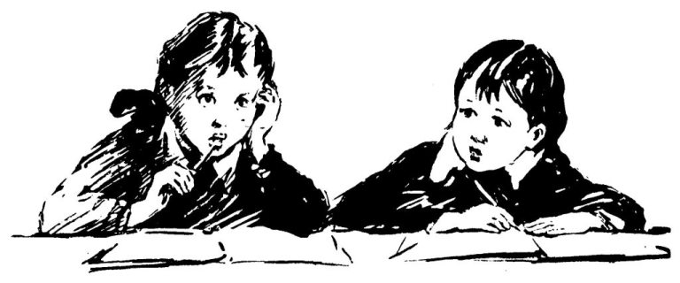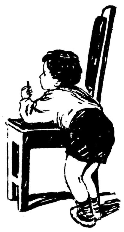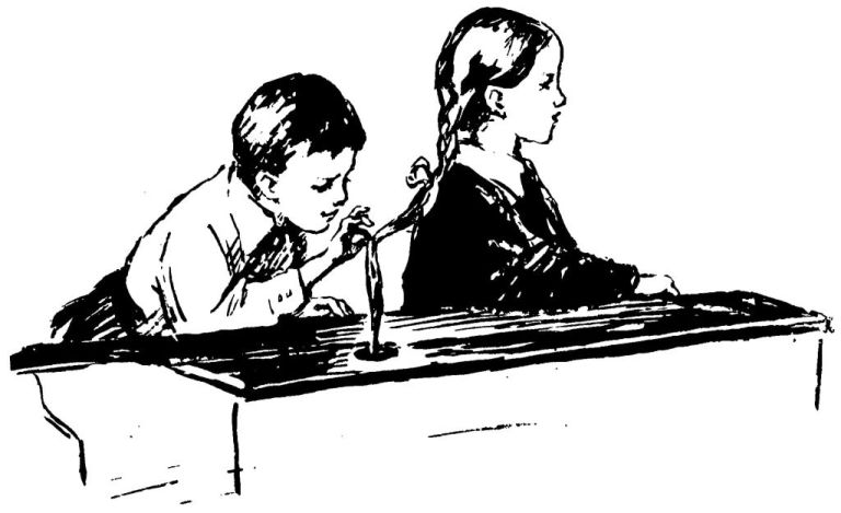 Учительница стоит спиной к классу: она записывает на доске задание на дом. С досады, что нет под рукой резинки, Женя быстро нагибается и щёлкает Валерку по затылку.