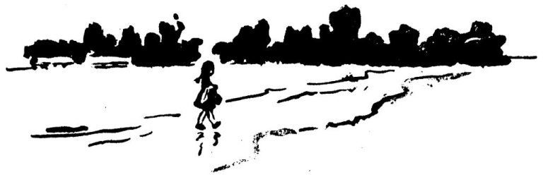 Катя и дух перевести не успела — шерстистая коричневая гора качнулась возле самого Катиного носа. Это корова пронесла мимо свой бок, чуть не задев Катю. А сзади уже показалась новая пара рогов. И ещё… и ещё… Катя прижалась спиной к забору, не в силах даже крикнуть. И тут как завопит кто-то: — К-куда-а? Щёлкнуло оглушительно. Коровы шарахнулись к середине дороги, а из-за коров выскочил босоногий мальчишка в мятом картузе и в длинной, не по росту, куртке со свисающими полами. Он бесстрашно кидался на коров, щёлкал длинным кнутом. Заметив Катю, он задержался на месте, засмотрелся на неё. Потом, не спуская с Кати глаз, некоторое время пятился задом. Спиной он натолкнулся на остановившуюся неподвижно корову. Даже не оглянувшись, мальчишка отпихнул её плечом. Вот это смельчак так смельчак! А у Кати ноги мелко дрожали. Она ещё постояла немножко и пошла за дом. Дорога через поле была чёрная и мягкая. Грязь прилипала к подошвам туфель, и Катя не без труда отдирала ноги от земли. По сторонам нежно зеленели какие-то всходы. Солнце светило тут ещё ярче, чем на дороге между домами. Высоко над Катиной головой заливисто пел жаворонок. Катя задрала кверху голову, чтобы посмотреть на птичку, которая поёт так чудесно. Её ослепила лазурь — пришлось зажмуриться. Стало очень жарко. Катя сняла пальто, понесла его на руке, потом на плече. Туфли сделались тяжёлыми от налипшей грязи — еле ногу поднимешь. Катя подобрала палочку и кое-как обскребла туфли, а через несколько минут к ним опять пристали целые пласты липучей грязи. — Ты что посерёдке маешься? — окликнул женский голос. — Этак вовсе увязнешь. По самому краю дороги шла женщина в платочке, повязанном под подбородком. — Ты по кромочке иди, — замедляя шаги, посоветовала она. — Да и разулась бы. Босиком-то куда ловчее. Ковыляя в облепленных грязью туфлях, Катя выбралась на край дороги, туда, где стояла женщина. — Городская, поди? — приветливо спросила та. — Далече идёшь? — В Дубки, — несмело ответила Катя и замерла с приоткрытым ртом: вот сейчас встречная тётенька скажет: «Какие Дубки? Не туда и идёшь вовсе». Но женщина сказала другое: — По короткой дороге, значит, направилась? По шоссейке дорога чище, да там далеко. А тут через лес живо добежишь. Ты так и держись этой дороги, никуда не сворачивай. А кто у тебя в Дубках? — Тётя. — Я тамошних не знаю, проходила только… Ну, беги, беги! — Легко ступая босыми ногами, женщина отправилась дальше. Разговор с женщиной очень ободрил Катю. Идти «по кромочке» было, и правда, гораздо легче. Однако лес никак не хотел приблизиться: всё так же чернел вдали. Тогда Катя решила его перехитрить. Она не стала глядеть вперёд, а только себе под ноги и по сторонам. А сама всё шла да шла. Потом вдруг как глянет вперёд: ну-ка, где ты там, лес? Хитрость помогла. Лес стал ближе. Зато ноги опять еле тащились. Ещё и плечи заныли отчего-то. Катя рассердилась и заставила себя побежать. Пощупала уточку в кармане и потруси́ла рысцой. Кусты на опушке уже хорошо видны. «Скорее, кустики, ко мне подбегайте!» Возле пенька Катя свалилась на изумрудную траву, под которой желтела прошлогодняя листва. Полежала с минуту неподвижно, прикрыв глаза и вдыхая свежий, вкусный грибной запах земли. Потом поднялась, пальто отряхнула, хотела берет на голове поправить. А его и нет. Посмотрела Катя вокруг, пальто потрясла, в карманах п