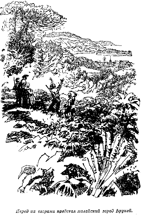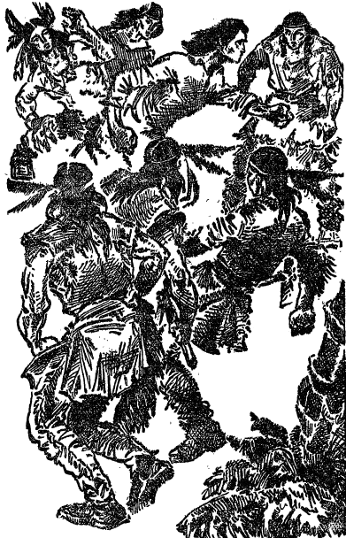 Ночью доктора Люиса разбудил странный шум, в котором он различил человеческие голоса и конское ржание. Он бросился к костру, чтобы затушить его, но, к счастью, тот сам потух; затем доктор осторожно разбудил всех, предупредив об опасности, а сам выглянул в трещину скалы. Он сразу увидел группу рослых индейцев с длинными волосами; столпившись возле шлюпки, они о чем-то оживленно толковали, причем часто слышались слова los cristianos, так называют южно-американские дикари белых. Очевидно, они вообразили, что тут высадилась толпа испанцев, и решили, собравшись целым племенем, напасть на них. Во всяком случае видно было, как они, соскочив с лошадей, привязали их к деревьям, а сами сели в шлюпку и поплыли вниз по течению. Выждав, когда шлюпка скрылась из виду, наши друзья вышли из пещеры. Необходимо было немедленно решить, что делать. Общее мнение было — не терять времени и, навьючив весь багаж на индейских лошадей, немедленно бежать в горы, пока не вернулись дикари, бывшие, конечно, только разведчиками, с отрядом своих соплеменников. Поспешно навьючили багаж на трех лошадей, прихватив парус со шлюпки, принесенный в пещеру для починки, на четвертую лошадь усадили супругов Мертон, на пятую — Чарльза с Мери, шестую взяли Том и Матильда, а Люис, Джек и Нанни пошли пешком. Лошади были крепкие и послушные. На каждой была узда и седло из шкур, мехом вверх. На седле были приторочены длинное лассо, сплетенное из нескольких ремешков, и боласы, излюбленное оружие в Южной Америке среди дикарей и гаучосов. Болас — это два-три каменных шара с куриное яйцо величиной, обтянутые сыромятной кожей и прикрепленные к концу плетеных ремней длиной в четыре-шесть футов. Когда, покрутив над головой, охотник с силой бросает это нехитрое оружие, шары, увлекаемые собственной тяжестью, обматываются вокруг ног намеченной жертвы, и та падает, как подкошенная. Чарльз и доктор умели ловко управляться с боласом и обещали научить и мальчиков бросать это оружие. Кроме того под деревьями, где были привязаны индейские лошади, нашли три оставленных индейцами копья из бамбука, сажени в две длиной, с железными прекрасно заостренными наконечниками… Утро только занималось, когда, покончив с укладкой, наши друзья тронулись в путь. Пройдя несколько миль по берегу, они свернули влево и стали пробираться через густой подлесок. Люис и Джек, с топорами в руках, расчищали дорогу. Не отъехали они и пятнадцати миль, как пришлось остановиться на отдых, так как солнце жгло невыносимо, и продолжать путь было крайне тяжело. Лошадей развьючили, подушки и одеяла разложили на земле и, закусив, прилегли отдохнуть. Отдыхали часа два, зато встали свежими и бодрыми, готовыми к новым трудам. Идти же стало еще труднее, подлесок перешел в дремучий лес. Наконец через пять часов утомительного пути вышли к быстрой, мелкой речке, на берегу которой и решили сделать привал. Ночь прошла спокойно. На рассвете поднялись, запаслись свежей водой и снова двинулись в путь. Воздух становился суше и чище, чем был на влажных равнинах, и даже слабая миссис Мертон оживилась от этой перемены. Пробудившаяся от сна природа звенела на разные голоса; со всех концов доносилось пение незнакомых птиц, трескотня темно-зеленых попугаев. Попугаи до того надоели, что Джек не выдержал и ударом своего боласа свалил пару толстых крикунов. Из них могло