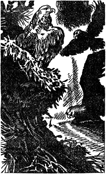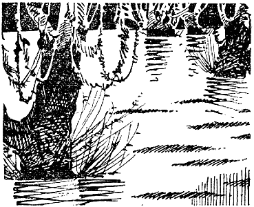 Когда рассвело, вода все еще держалась на прежней высоте. Я решил пробить себе дорогу через лес для того, чтобы разъяснить загадку с озером. Это странное явление было для нас предметом серьезного беспокойства. Взяв ружье и топор для того, чтобы прорубить себе проход через лес, я отправился один, оставив Куджо и сыновей для охраны стоянки. Преодолев около двух миль, я вдруг очутился на берегах ручья. Представьте, каково было мое удивление, когда я увидел, что он не только не разлился, но в его русле воды было даже меньше обычного! Вода была мутная, а зеленые листья и недавно сломанные деревья неслись по течению. Я возвратился к верховью ручья, полагая, что там должна находиться плотина. Я начал думать, что здесь вмешалась рука человека, и стал уже искать следы человеческих ног, но не нашел. Зато увидел следы многих животных. Шел я, все-таки соблюдая предосторожность. Наконец, добрался до изгиба ручья, где, как помнилось, русло постепенно суживалось и с обеих сторон было окаймлено довольно высокими берегами. Именно здесь я должен был найти разгадку к тайне, связанной с появлением озера. Я не ошибся. Передо мной была намеренно воздвигнутая плотина. Поперек ручья лежало большое дерево, а вокруг него — куча камней и ила. Напротив дерева были вбиты в землю длинные колья. Они образовали что-то вроде плетня, прочно укрепленного камнями. Казалось, что только человек способен на такое. Между тем это было не так. Строители были перед моими глазами и, по-видимому, отдыхали после работы. Я увидел их, по меньшей мере, сотню. Они лежали, притаившись на земле и вдоль плотины. По цвету и размеру они походили на гигантских крыс, но хвост у них был гораздо длиннее, совершенно не покрытый шерстью и заостренный к концу, спина сгорблена, туловище округленное, как у всех животных из рода крыс. Кроме того, у них были длинные резцы, характеризующие грызунов. Уши у этих животных были короткие и наполовину скрытые под шерстью. Шерсть длинная и гладкая. По обе стороны ноздрей торчали длинные пучки волос, наподобие усов кошки. Передние лапы короче задних, и те и другие снабжены когтями. Хотя я этих животных никогда не видел, однако по всем признакам понял, что это бобры. Загадка была разгадана. Колония бобров переселилась в долину и воздвигла плотину, вызвавшую внезапное наводнение. Сделав это открытие, я какое-то время наблюдал за действиями этих интересных созданий. Одни из них лежали на плотине и грызли торчавшие из ила листья и ветки; другие, резвясь, купались в воде, третьи, сидя на задних лапах возле плотины, время от времени ударяли по воде своими тяжелыми хвостами, как делают прачки, стирающие белье. Постояв несколько минут в укрытии, я решил показаться, чтобы посмотреть, какое впечатление произведет на них мое присутствие, как вдруг увидел, как что-то спугнуло животных. Бобер, сидевший на дереве на некотором расстоянии от озера как бы на страже, бросился вниз и три раза ударил своим тяжелым хвостом по воде. Это, очевидно, был сигнал. Сразу после этого животное бросилось в озеро и исчезло, как бы спасаясь от преследований. Все остальные бобры проделали то же самое. Теперь я понял причину этого внезапного бегства — на том месте, откуда исчез бобер, бывший на страже, стояло необычное животное. Оно двигалось медленно и бесшумно, карабкаясь между деревьями и держась близ бер