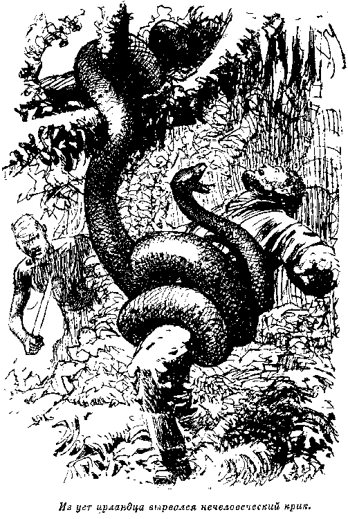 Эта новость была встречена криками радости. Каждый хотел лично убедиться в том, что это соль, и пробовал ее. Мы влили в наш полевой котел около двух ведер воды и после выпаривания получили не менее трех фунтов соли. Из этого мы могли заключить, что в воде нашего источника процентное содержание соли выше, чем в морской воде. Вынув из котла всю соль, мы снова наполнили его водой и поставили на огонь. Рядом с котлом поставили сковородку и Мария начала жарить на обед куски дичи, приправленные солью. В это время наше внимание привлек громкий крик. Похоже, его издавала голубая сойка. Услышать голос этой птицы среди белого дня не редкость. Но так она кричит в случае, если перед ней враг: ее голос становится резким и неприятным. Именно поэтому он и привлек мое внимание. Мы посмотрели в ту сторону, откуда доносился крик. Ветви одного невысокого дерева сильно колебались, а в них билась птица светло-голубого цвета, старавшаяся улететь. Посмотрев на землю, мы увидели то, что приводило в трепет птицу. По траве и сухим листьям медленно и бесшумно ползло мерзкое пресмыкающееся — змея. Ее светло-желтое с черными пятнами тело сильно блестело. Она то поднималась, то опускалась и подвигалась вперед почти по прямой линии, закинув голову вверх. Время от времени она останавливалась, опускала плоскую голову, держа ее в горизонтальном направлении, огненного цвета языком задевала траву, а затем снова начинала двигаться. Ее хвост оканчивался твердым отростком, около фута длиной. Этот отросток походил на четки из желтых неровных шишек. Перед нами была страшная гремучая змея с гремящими роговыми кольцами на конце хвоста. Я остановил своих спутников и собак. Мне не раз говорили о способности этого отвратительного пресмыкающегося «гипнотизировать» многих животных. Нам представился случай понаблюдать, правда ли это или нет: удастся ли гремучей змее «околдовать» сойку? Змея добралась до одной большой магнолии. Затем она медленно свернулась в коническую спираль. Глаза были закрыты. Казалось, что змея спит. Я посмотрел на одно из излюбленных белками деревьев, в которых они строят свои гнезда. В дереве находилось дупло, вокруг отверстия была снята кора, и виднелись следы лап белок. Осматривая кору, можно было убедиться в том, что белки спускаются и подымаются с этой стороны. Гремучая змея приютилась так близко, что, казалось, ни одно животное не ускользнет от нее! Мы поняли, что змея поджидает белку, и решили посмотреть, чем это кончится. Наконец из дупла показалась маленькая головка, похожая на голову крысы. Но животное продолжало оставаться в этом положении, казалось, оно хотело опять скрыться. Мы уже готовы были отказаться от дальнейших наблюдений, потеряв надежду увидеть что-нибудь интересное, как вдруг наше внимание было привлечено шуршанием сухих листьев. Мы посмотрели в ту сторону и увидели другую белку, направлявшуюся к дереву. Она бежала очень быстро, как будто ее преследуют. Так и было на самом деле. Скоро мы увидели другое животное, гнавшееся за нею. Это был длинный и тонкий зверек, вдвое больше белки, яркого желтого цвета, мы сразу узнали, что это — ласка. Гремучая змея раскрыла свои челюсти, готовая броситься на добычу. Белка стремглав бежала к дереву, время от времени оглядываясь назад. Вдруг, в мгновение ока, змея, сильно вытянув голову, ударила белку на ходу