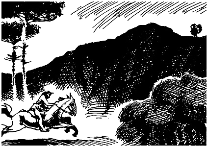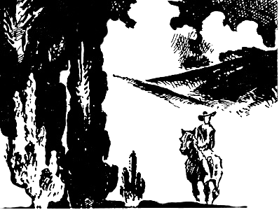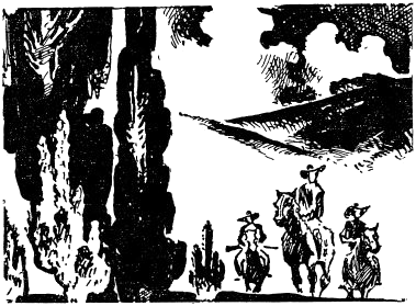После столь долгого и трудного путешествия единственным нашим желанием было отдохнуть и собраться с силами. Мы хотели остаться на берегу ручья на всю ночь, а может даже на день-два. Ивы тянулись на протяжении девяноста миль. В тени деревьев мы заметили особого рода траву, растущую исключительно в Мексике и известную там под названием Grammifes. Это — очень сочная и питательная трава, одинаково приятная как диким, так и домашним животным. Вскоре мы убедились в этом: утолив жажду, наши лошади и мулы сразу же набросились на траву, глаза их блестели от жадности. Мы сняли с них багаж и седла, привязали их к кольям и дали им возможность есть вволю. После этого мы принялись готовить ужин. Нам недолго пришлось страдать от голода. Во время путешествия по равнине время от времени мы употребляли в пищу сырую сушеную говядину, хотя жареная она не намного вкуснее. Питаясь таким образом больше недели, мы, естественно, горели желанием поесть свежего мяса. Всю дорогу от Эль-Пасо нам не встретилась дичь, если не считать полдюжины тощих антилоп, из которых удалось убить только одну. Пока мы привязывали животных и готовили ужин, один из охотников, по имени Линкольн, выстрелил. Все подняли глаза вверх и увидели целое стадо бигорнов, диких баранов, перепрыгивавших со скалы на скалу и устремившихся к вершине горы. Линкольн показался из оврага, держа в руках животное, которое мы сразу узнали по форме рогов в виде полумесяца: оно, бесспорно, принадлежало к только что скрывшемуся стаду. Обрадовавшись добыче, мы наскоро нарубили дров и приготовили вкусный ужин. После ужина каждый из нас укутался в свое одеяло и совершенно забыл о пережитых нами невзгодах. На второй день мы проснулись со свежими силами и, позавтракав, стали совещаться, в каком направлении продолжать путь. Мы с удовольствием пошли бы по течению ручья, если бы оно не было направлено к югу, где нам нечего было делать. Нужно было идти на восток. Во время нашего совещания наше внимание привлек крик Линкольна. Он стоял среди равнины недалеко от ив и смотрел на юг. Мы обратили к нему наши взоры и, к великому нашему изумлению, увидели высокий столб дыма. — Это — индейцы! — воскликнул один из наших спутников. — Прошлой ночью, — сказал Линкольн, — подстерегая бигорна, я заметил там внизу на поляне странное углубление. Оттуда и идет дым, который вы видите сейчас, где есть дым, там должен быть огонь, а огонь сам собой не загорается. Следовательно, там находятся люди, — либо краснокожие, либо белые. — Индейцы! Без сомнения, индейцы! — воскликнули некоторые из присутствовавших. — Кто другой мог бы быть здесь, на расстоянии сотен миль от всякого жилища? Это — индейцы! Мы стали совещаться о том, как быть дальше. Огонь был потушен, лошади и мулы скрыты в тени деревьев. Одни советовали отправить небольшую группу для разведки вдоль ручья, другие предлагали взобраться на гору для того, чтобы рассмотреть то место, откуда подымался дым. Решили, что шесть человек из нас поднимутся на гору, остальные будут ждать внизу. Мы карабкались вдоль оврага, время от времени останавливаясь для того, чтобы бросить взгляд на равнину. Нам удалось заметить луч света, но расстояние было довольно большое, чтобы можно было что-то различить. Перед нами расстилалась обширная высохшая и бесплодная равнина. Лишь с западной стороны виднелся растительны