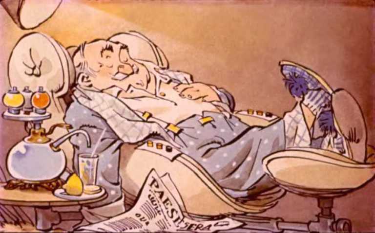 Ночь прошла в тщетных попытках заснуть. Но Катерино не пал духом и, когда утром он с неизменной чашечкой кофе на подносе отправился будить хозяина, решил усилить наблюдение. В тот день, например, он заметил, что сразу же после еды профессор удобно устроился в кресле с газетой в руках.