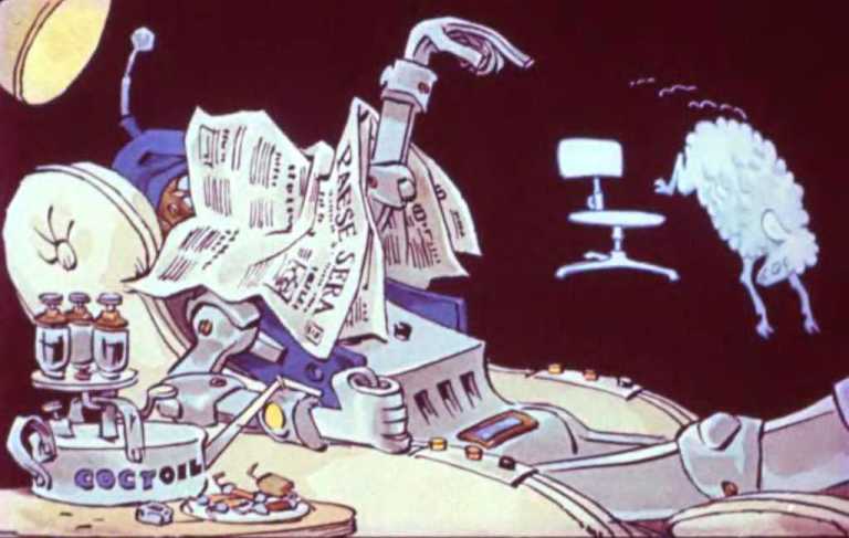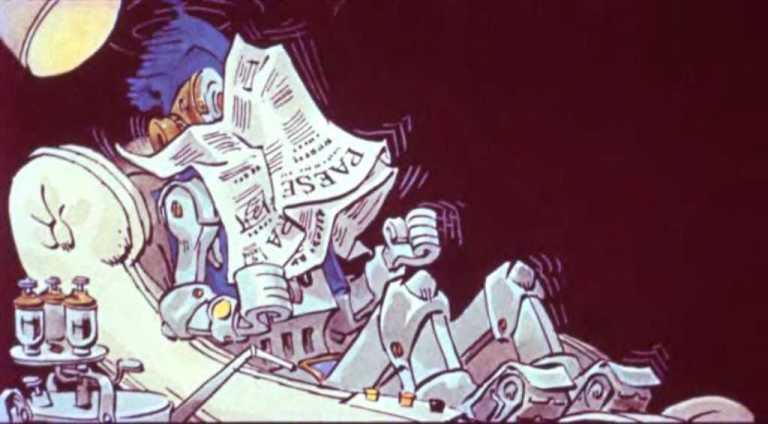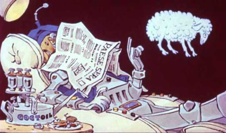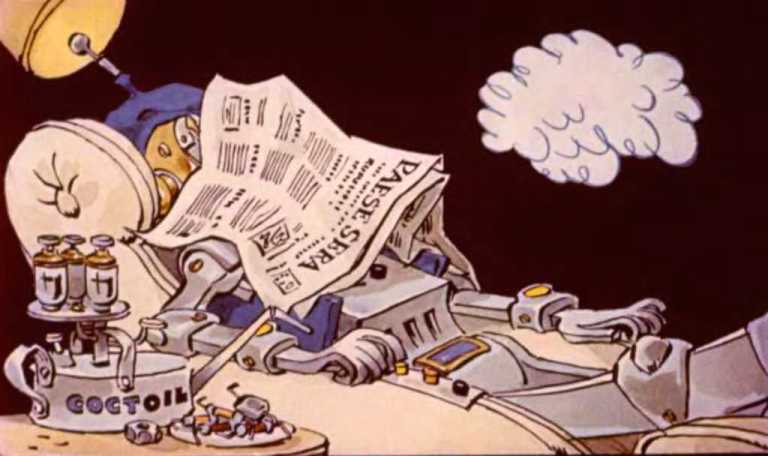 «Верно, это ночная песня», — подумал робот. Он с трудом дождался ночи, и едва все улеглись, сел в кресло и принялся читать газету. Он прочел ее от первой до последней строчки, включая рекламные объявления, но сон не приходил. Тогда он стал пересчитывать точки и запятые на каждой странице, затем все слова, которые начинаются с буквы «а», но и это не помогло.