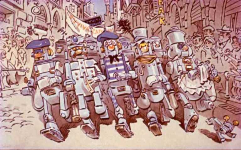 Пришлось властям Рима заключить соглашение с роботами. После Рима настал черед Милана, Турина, Марселя, Лондона и Тимбукту. Когда Катерино вышел из тюрьмы, его встречали десятки, нет, сотни тысяч роботов. Они кричали: «Ур-ра нашему славному Катерино!» и громко аплодировали. А Вибиальди, домашний робот дирижера оркестра трамвайщиков, сочинил по столь торжественному случаю прекрасный гимн: