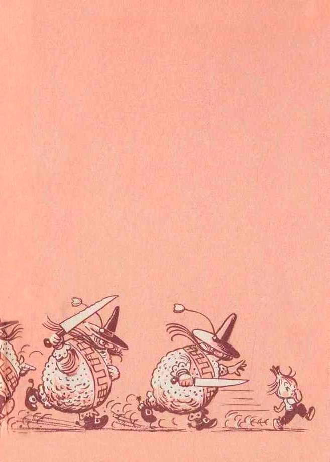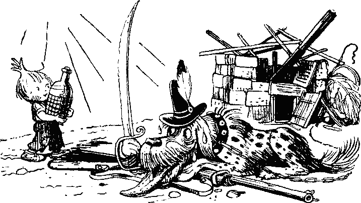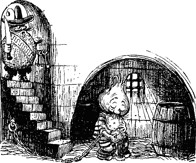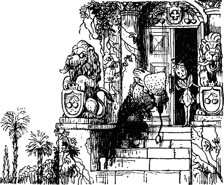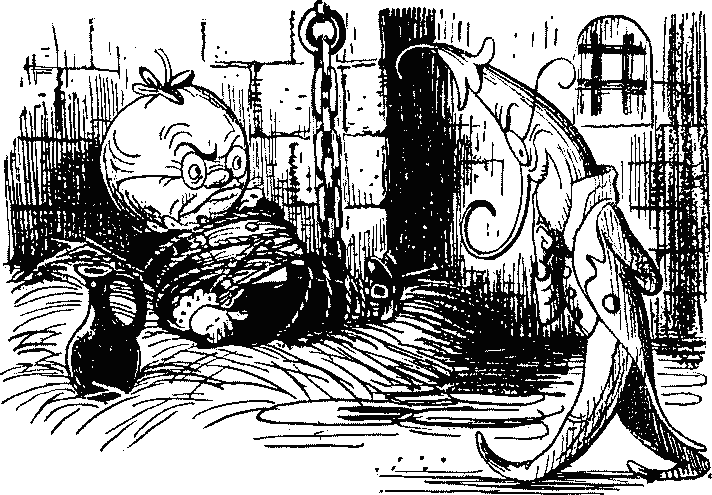И в самом деле, кавалер Помидор (ведь это он бежал по лестнице, — разве вы не узнали его?) так разбух от злости, что дверца оказалась вдвое уже его туловища.