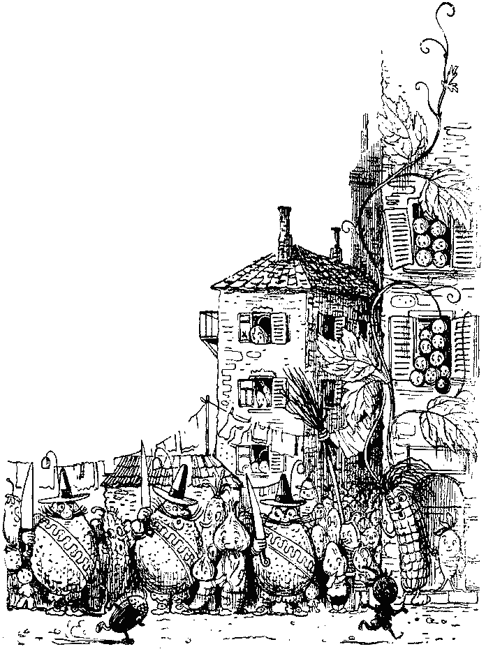 — Вот вам! — заявил Помидор, угрожающе посматривая вокруг. — Теперь все ваши мальчишки научатся уважать меня, а прежде всего — тот пришлый оборванец, которого мастер Виноградинка взял к себе в дом.