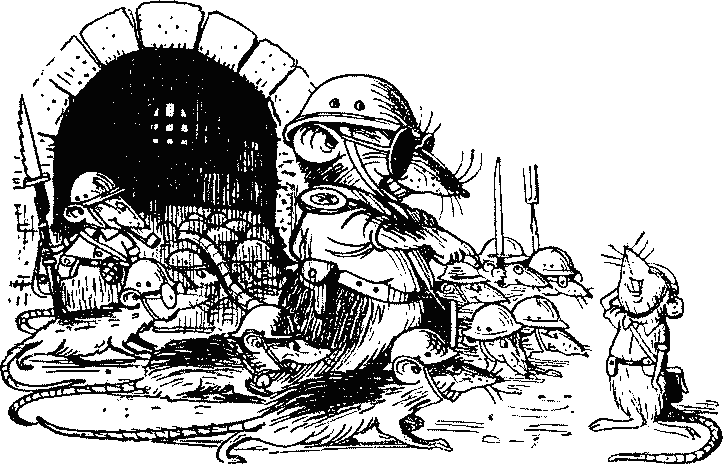 И вдруг он тоже увидел знамя на башне. Закрыв глаза от ужаса, он бросился бежать со всех ног, повернул направо, налево, выбежал за ворота и снова забрался в своё надёжное убежище — рыхлую навозную кучу, надеясь, что его там не найдут.