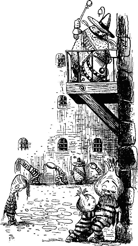 Это на окраину прибыл сам правитель со свитой Лимонов, Лимонишек и Лимончиков. Принц Лимон был одет во все жёлтое с ног до головы, а на жёлтой шапочке у него побрякивал золотой колокольчик. У придворных Лимонов колокольчики были серебряные, а у солдат-Лимончиков — бронзовые. Все эти колокольчики звенели, не переставая, так что получалась великолепная музыка. Послушать её сбежалась вся улица. Народ решил, что пришёл бродячий оркестр.