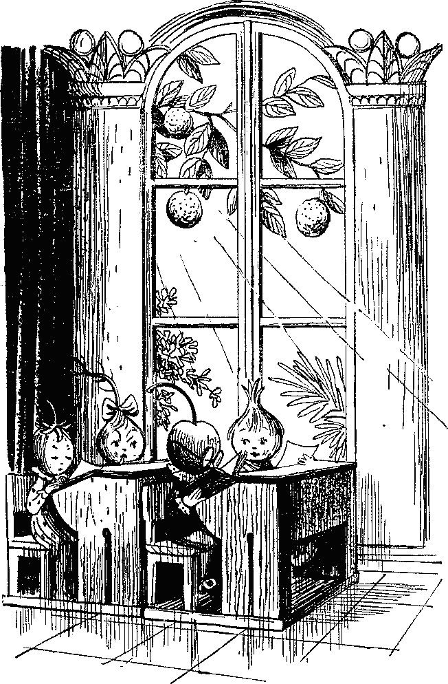 Замок уже больше не замок, а Дворец детей. Там есть и комната для рисования, и театр кукол с Буратино, и кино, и пинг-понг, и множество всяких игр, Разумеется, там есть и самая лучшая, самая интересная и полезная для ребят игра — школа. Чиполлино и Вишенка сидят рядом на одной парте и учат арифметику, грамматику, географию, историю и все остальные предметы, которые надо хорошенько знать, чтобы защищаться от всяких плутов и угнетателей и держать их подальше от родной страны.