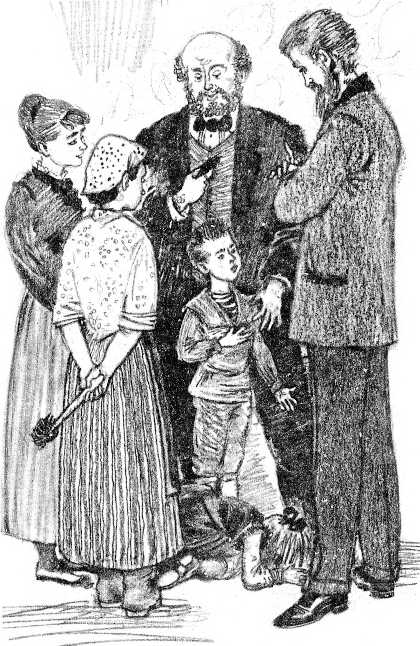 Мы так с куклами и замерли, еле руками шевелим. Таня дрожит и бормочет за куклу: — Здравствуйте. Как вы поживаете? Сколько вам лет? Как вы поживаете? Сколько вам лет? Вдруг дверь к нам отворяется: отец распахнул. — А вот это, — говорит, — мои сорванцы. Важный стоит в дверях, чёрная борода круглая, мелким барашком, и улыбается толстым лицом: — А, молодое поколение! Ну, как все говорят. А за ним стоит Фроська и держит шубу нараспашку. Отец нахмурился, мотнул нам головой. Танька сделала кривой реверанс, а я что было силы шаркнул ножкой. — Играете? — сказал важный и вступил в комнату. Присел на корточки, взял куклу. И я вижу, в дверях дура Фроська стоит и растянула шубу, как будто нарочно распялила и показывает. И это пустое место без хвостика так и светит. Важный взял куклу и спрашивает: — А эту барышню как же зовут? Мы оба крикнули в один голос: — Варя! Важный засмеялся: — Дружно живёте. И видит вдруг у Таньки слёзы на глазах. — Ничего, ничего, — говорит, — я не испорчу. И скорей подал пальчиками куклу. Поднялся и потрепал Таню по спине. Он пошёл прямо к шубе, но смотрел, на отца и не глядя стал попадать в рукава. Запахнул шубу; Фроська подсовывает глубокие калоши. Не может быть, чтобы отец не заметил. Но отец очень весёлый вошёл к нам и сказал смеясь: — Зачем же конём таким? И представил, как я шаркнул.