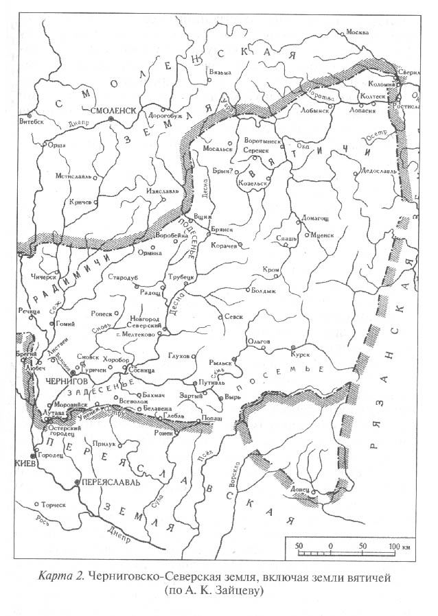 Всеволод Юрьевич вступил в войну с Ольговичами только в самом конце лета или начале осени 1196 года. Но и при нём военные действия по-прежнему шли вяло. Что в общем-то неудивительно. И сам Всеволод по возможности избегал кровопролития и отнюдь не питал склонности к решительному наступлению, предпочитая выжидать, когда победа сама упадёт к нему в руки, и его союзники Рюрик и Давыд никогда не принадлежали к числу выдающихся полководцев, нередко уклоняясь от войны даже тогда, когда другие князья призывали их к этому. В полной мере то же относится и к их главному противнику Ярославу Черниговскому, также стороннику выжидательных действий. И хотя «Слово о полку Игореве» характеризует его как одного из сильнейших в военном отношении русских князей — «сильного, и богатого, и многовоя» (перечисляя далее, помимо «черниговских былей» — бояр, каких-то неведомых нам «могутов, и татран, и шельбиров», и прочие, по-видимому торкские, кланы, кои «без щитов», с одними засапожными ножами «кликом полки побеждают»)104, — Ярослав всё же вошёл в историю русского XII века более как интриган, нежели воин. В общем, доблестных военачальников не оказалось ни в одном из лагерей — ибо Роман Мстиславич ещё не до конца оправился от ран, самый удалой из черниговских князей, «буй-тур» Всеволод Святославич, скончался как раз в мае того же 1196 года, а его младший тёзка, энергичный племянник Ярослава Всеволодовича Всеволод (прозванный Чермным), оставался пока что на вторых ролях. В войско Всеволода, как обычно, вошли полки рязанских и муромских князей. Явились и половцы, за которыми князь посылал ещё зимой. По-видимому, Всеволод тщательно просчитывал различные варианты развития событий. Так, новгородскому полку он повелел выступить к Великим Лукам — городу на реке Ловать, «оплечью» Новгорода на юго-западе Новгородской земли: очевидно, новгородцы должны были стеречь полоцких князей, союзников Ольговичей, а также враждебную Новгороду Литву. По версии суздальского летописца, Всеволод начал войну прежде всего ради свата, Рюрика Ростиславича, «твердя» под ним княжение в Киеве105. Но и свои интересы он, несомненно, преследовал тоже. Его полки действовали совместно с полками Давыда Ростиславича. Удар объединённой рати пришёлся на Вятичскую землю, соседнюю с «Залесской». Союзники разоряли и жгли вятичские города (Татищев называет два из них: Козельск и Волхов). «И землю их пусту створи», — свидетельствует суздальский летописец; соответственно, поток пленников и добычи устремился в обратном направлении — к Суздалю, Рязани, Мурому и Смоленску. Ну и, конечно, немалая добыча доставалась половцам, приведённым Всеволодом; они всегда охотно разоряли русские города и сёла. Что же касается Рюрика Ростиславича, то он только осенью узнал о том, что Всеволод исполнил, наконец, своё обещание и «всел на коня», соединившись с его братом Давыдом. «А я сижу наготове, ожидая от них вести верной», — сообщал Рюрик в письме галицкому князю Владимиру (текст этого письма дошёл до нас в составе Ипатьевской летописи). Общий план кампании предусматривал, что князья должны встретиться у стен Чернигова, чтобы совместно взять столицу княжества или принудить черниговского князя к капитуляции. Но когда следует выступить, Рюрик не знал и продолжал воевать с Ольговичами в одиночку, сам по себе, терпя при этом н