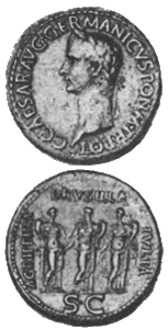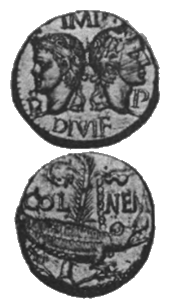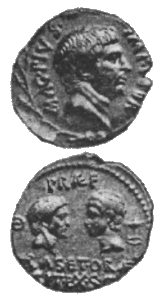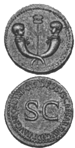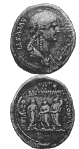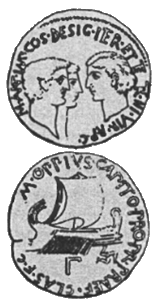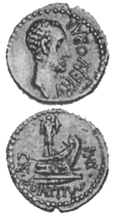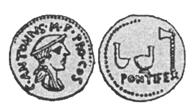 Денарий Гая Антония, среднего брата Марка Антония, казненного по приказу Марка Брута. Такие денарии чеканились Гаем Антонием в начале 43 г. до н. э., когда он воевал с Марком Брутом за Македонию