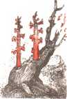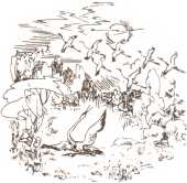 Куда ни посмотришь в зимнем лесу, всюду снег. Кругом комья, пласты и снежные кружева. Не сразу разберёшь, где ёлочка, где пенёк. Однако пеньки закрылись — и их не видно, а ёлочки обязательно где-нибудь да высунут колючую лапку. Небольшая ель запахнулась в белую шубу с головой и стоит себе. Будто тётенька, закутанная в пуховый платок. В руках у неё сумка хозяйственная: это ком снега так пристроился. Я чуть было «Здравствуйте» не сказал, когда ёлка слегка качнулась: думал, и впрямь кто-то идёт мне навстречу. А ёлочки-малютки в снежных комьях — словно совы белые расселись под большими деревьями. Весь лес убран снегом. К стволам, как гвоздями, сухими сучьями прибиты комья и комочки. Интересно! Я достал блокнот, погрел руки за пазухой и стал рисовать. Первой зарисовал ёлку-тётку в шубе, с сумкой. Затем снежную арку. Она похожа на низкие ворота — человеку не пройти. Только мышь проложила мелкую строчку, которую пересек заячий след... Дальше я иду не спеша и среди снежных фигур высматриваю диковины разные. Вот встретился на моём пути рыцарь. Это сосенка выставила свою вершину-крестик из комьев, похожих на шлем. Рыцарь с виду сердитый, недовольный чем-то. Таким я и нарисовал его. Подул на пальцы, перевёл взгляд кверху. Ба! Рябиновые кисти свесились надо мной. Опушённые снежком, они будто краснощёкие барышни-боярышни в белых шапках. — Здравствуйте! — сказал я и задел ветку. Боярышни дружно закивали, а шапки свои не уронили: холодно. Замёрз и я. Глянул с завистью на деревья в боярских шубах и побежал, быстро отталкиваясь палками, чтобы согреться.ДЕСАНТ