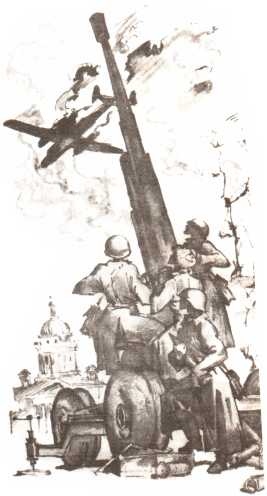 Да, это город-фронт. Посреди города лежит площадь Жертв Революции. Раньше она называлась Марсовым полем. Бог войны — артиллерия сегодня гремит над этой площадью, и длинные языки пламени рвутся к сумеречному небу. Клубы дыма встают по сторонам. Ветки, сорванные взрывами, усыпают мостовую. Воздух рвётся на куски. Самые разные грохоты гуляют в небе и на земле. Это налёт. Постылый лязг немецких самолётов над самым полем. Пикируя, немец хочет попасть в зенитную батарею. Бомба падает в стороне. Огромный столб дыма заволакивает Летний сад. Свист и рёв, лязг и визг. Но девушки-зенитчицы ловят на прицел воздушного бандита. Им не до страха. Они потом будут волноваться и переживать. Сейчас они ушли в свою трудную работу. Они забыли про шутки и про друзей, про всё. Они — бойцы, защищающие свой родной город.