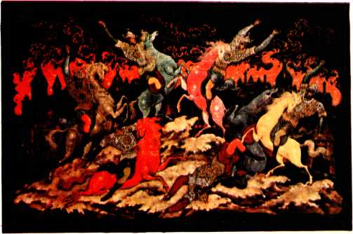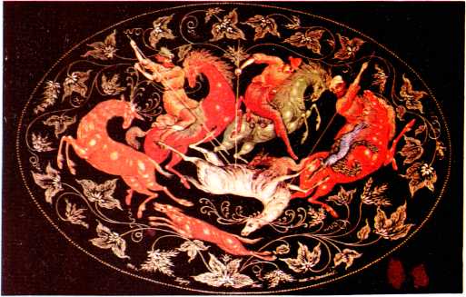 В общем, наполовину художники, наполовину — крестьяне. Иван Иванович Голиков, как и его отец и дед, тоже был иконописцем. Но только начал самостоятельно трудиться, забрали в солдаты. Участвовал в империалистической войне. Октябрьскую революцию встретил в 27-м Сибирском стрелковом полку. Когда же вернулся домой, икон в селе уже никто не писал, никому они стали не нужны. А как хотелось взять в руки кисти, как хотелось окунуть их в огненную киноварь, в золотистую охру, в изумрудную зелень и класть эти краски одну к другой, чтобы из них получились в конце концов целые сцены, люди, кони, деревья, облака! И чтобы всё было таким же необыкновенным, героическим и радостным, как вся новая жизнь, которая начиналась в молодой стране. Но что он умел? Умел лишь писать торжественных святых так, как их писали на Руси и сто и пятьсот лет назад: нереально удлинённых, в полусказочных нарядах и обстановке. И всё-таки Голиков изобразил таким манером обыкновенного пахаря. Получилось очень любопытно. Потом написал на маленькой лаковой шкатулке лихую тройку. Коней сделал красными, как в древнерусской живописи, но они у него не гарцуют, а летят как вихрь и везут в саночках красноармейца. То есть сказка и правда тут в одно целое слились.