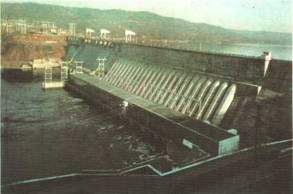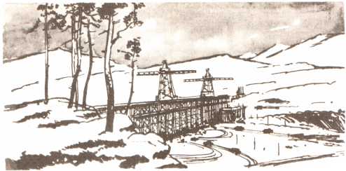 Ночью Серёга долго не мог заснуть: наверное, днём выспался. По улице всё время проходили тяжёлые машины, и свет их фар блуждал по комнате, высвечивая на стенах косые оконные переплёты... Наутро Званцев разбудил Серёгу ни свет ни заря, они позавтракали, а потом на автобусе поехали к Карлову створу, где возводилась плотина. Карлов створ оказался узкой расселиной между высоченными береговыми скалами. Енисей был здесь совсем не широк. А может, это только так представлялось. Званцев объяснил Серёге, что русло реки лежит глубоко внизу — метров на сто ниже дороги. Вот в эти береговые утёсы и будет врезана будущая километровая арка плотины. А пока ведутся работы по подготовке правобережного котлована. Дорога шла через мосты по террасе, которую строители отвоевали взрывами у мраморных и гранитных скал. На востоке вставало румяное от мороза солнце, и скалы вспыхивали разноцветными огнями, как исполинские призмы. Котлован был огромный. Он весь кишел техникой — самосвалами, кранами и бульдозерами. Званцев подвёл Серёгу к какому-то сооружению высотой с двухэтажный дом. Что это экскаватор, Серёга догадался по ковшу. Ковшичек был подходящий: в нём свободно могла бы уместиться легковая машина. — Это мой Эшка, — сказал Званцев.— Экскаватор шагающий 15-90. Хочешь, слазим наверх, пока нет пересменки? По металлическим ступенькам они поднялись внутрь машины. Здесь тоже всё было громадное, в рост взрослого человека: моторы, насосы, генераторы... Стальная лестница вела всё выше и выше. И когда Серёга вслед за Званцевым поднялся в стеклянную кабину, у него захватило дух. Отсюда — с высоты птичьего полёта — всё казалось игрушечным: и «БелАЗы», и бульдозеры, и даже поезда на железнодорожных путях. — Когда-то в Красноярске был землекоп-стахановец Павел Ямкин,— заговорил Званцев. — Так вот он вошёл в историю потому, что вынул за смену пятнадцать кубометров грунта. А знаешь, сколько кубиков выдает Эшка? Пять тысяч! — Пятнадцать — и пять тысяч!— вслух изумился Серёга. Но он был удивлён ещё больше, услышав, что Эшку заставляют работать полсотнидвигателей, а энергии он потребляет столько, сколько хватило бы для нужд целого посёлка. — Однако нам пора, — сказал Званцев.— Скоро смена придёт. — А у вас разве сегодня выходной? — спросил Серёга. И только тут до него дошло, что дядя Кеша поднялся спозаранку и приехал сюда единственно ради... — Неужели вы ради меня... — начал было Серёга, но Званцев махнул рукой: — Да нет, земляк! Просто я хотел взглянуть, не утащил ли кто моего Эшку. Всякое может случиться... Зелёные глаза дяди Кеши смеялись.*