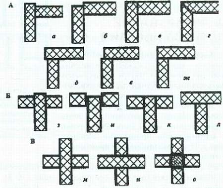 Рис. 2. Примыкание щитовых элементов в угловых соединениях мебели: А-Г — образные соединения: а — впритык с выступом; б — впритык с уступом; в — впритык заподлицо; г — на ус; д — внакладку со свесом; е — внакладку с уступом; ж — внакладку заподлицо Б-Т — образные соединения: з — впритык с выступом; и — впритык с уступом; к — впритык заподлицо; л — внакладку В — крестообразные соединения: м — впритык; н — внакладку; о — с монтажным бруском