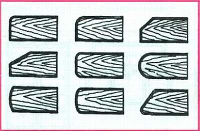 В приложении Д представлены формы и размеры рекомендуемых нормализованных профилей различных деталей мебели: колпаков, плинтусов, горизонтальных рамок, перегородок и крышек, пилястр, обкладок полок, штапиков, верхних и вертикальных брусков спинок стульев, брусков сидений, задних ножек стульев и кресел. Для изготовления верхних поликов кухонной мебели могут применяться щиты с сотовым заполнением. Лицевые поверхности верхней и нижней стенки, недоступные для обозрения (у высокой мебели верхняя поверхность, у низкой мебели нижняя поверхность), могут быть облицованы шпоном менее ценных пород древесины, в том числе шпоном лущеным. Характер верхних поликов с закругленными углами должен быть хорошо продуман (рис. 3). Швы должны быть безупречно пригнаны.