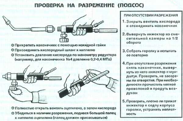 ПРИ ОТСУТСТВИИ РАЗРЕЖЕНИЯ 1. Закрыть вентиль кислорода и отсоединить наконечник 2. Вывернуть инжектор из смесительной камеры на 1/2 оборота 3. Собрать горелку и испытать ее повторно 4. При отсутствии разрежения снять наконечник, вывернуть из него инжектор и мундштук. Проверить, не засорены ли отверстия. При необходимости прочистить мягкой проволокой и продуть воздухом 5. Проверить, плотно ли прижат инжектор к седлу корпуса горелки, устранить неплотность