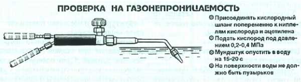 - Присоединять кислородный шланг попеременно к ниппелям кислорода и ацетилена - Подать кислород под давлением 0,2–0,4 МПа - Мундштук опустить в воду на 15–20 с - На поверхности воды не должно быть пузырьков