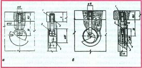 Рис. 8. Соединение щитовых элементов с помощью: а — винтовой стяжки с гайкой: 1 — гайка; 2 — винт; 3 — сегментная подкладка; 4 — заглушина; б — эксцентриковой стяжки: 1 — втулка «елочка»; 2 — винт; 3 — эксцентрик; 4 — заглушина