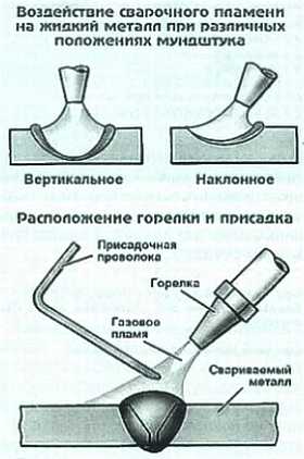 Пламя горелки направляют на свариваемый металл так, чтобы кромки находились в восстановительной зоне пламени на расстоянии 2–6 мм от конца ядра пламени (место максимальной температуры). Конец присадочной проволоки располагают в восстановительной зоне пламени или погружают в сварочную ванну