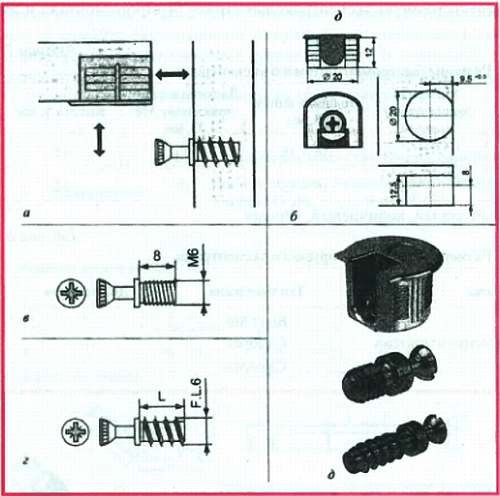 Рис. 13. Эксцентриковые стяжки быстрого монтажа: а — последовательность сборки щитовых элементов; б — быстромонтируемый эксцентрик и форма отверстий в щитах; в — стойка к эксцентрику быстрого монтажа (винт М6); г — стойка к эксцентрику быстрого монтажа (саморез); д — комплект эксцентриковой стяжки быстрого монтажа.
