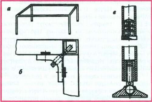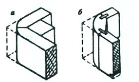 Рис. 5. Усиление прочности угловых соединений из древесностружечных плит с помощью: а — вставных реек; б — укрепляющих наклеек; в — раскладок из массивной древесины