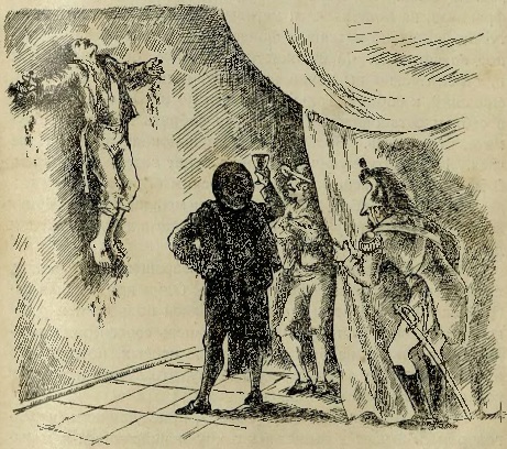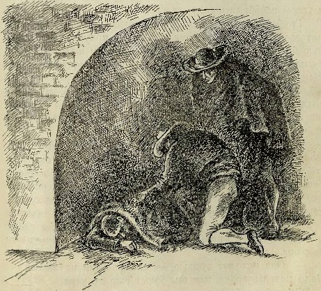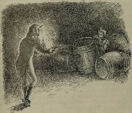 Невесело нам было в эту минуту, друзья мои. Вокруг нас возвышались груды пороха и мы знали, что, если взрыв проникнет через тонкую дверь комнаты, то о нас не останется и воспоминания. Ожидание было нестерпимо. Кто бы мог подумать, что полудюймовый фитиль будет гореть так медленно. Каждая секунда казалась вечностью. Я уже решил, что фитиль потух, как вдруг раздался оглушительный грохот. Наша дверь разлетелась в щепы и на нас посыпались сыры, репа, яблоки и осколки ящиков. Мы бросились в кладовую. Вся она была окутана непроницаемым дымом и засыпана всякой дрянью, но на месте черной двери виднелся горящий четырехугольник. Петарда сделала свое дело.