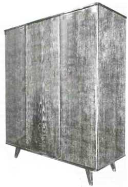 Конструкция и материалы. Шкаф собирается на эксцентриковых стяжках и круглых вставных шипах. Распашные двери навешиваются на четырехшарнирных петлях. При применении фиксирующих петель защелка не ставится. Шкаф устанавливается на скамейке. Полки устанавливаются на полкодержателях. Полуящики перемещаются по направляющим брускам. Щитовые элементы изготавливаются из древесностружечной плиты, облицованной шпоном строганым ценных или твердых лиственных пород. Детали скамейки изготавливаются из древесины твердых лиственных пород. Задние стенки и донья полуящиков — из твердой древесно-волокнистой плиты. Полуящики столярной конструкции. Полки из древесностружечной плиты, облицованной шпоном строганым. Штанга из древесины твердых лиственных пород. Фурнитура должна соответствовать требованиям стандартов. Все остальные показатели должны соответствовать проекту; утверждаемому в установленном порядке.