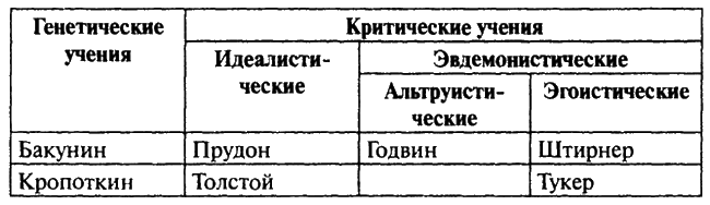 I. По отношению к своим основным принципам семь изложенных выше учений не имеют ничего общего. 1. Они признают высшим законом человеческого поведения, с одной стороны, только естественный закон, который, следовательно, не говорит нам ничего о том, чему долженствовало бы быть, а только то, что в действительности случится; эти учения можно назвать генетическими. С другой стороны, они считают за высший закон человеческого поведения норму, которая нам говорит, следовательно, что должно бы случиться, хотя, быть может, никогда и не случится в действительности; эти учения могут быть названы критическими. Генетическими являются учения Бакунина и Кропоткина; для Бакунина высшим законом человеческого поведения является эволюционный закон прогресса человечества от существования менее совершенного к возможно более совершенному существованию; для Кропоткина таким законом является эволюционный закон прогресса от менее счастливого существования к возможно более счастливому; критическими учениями оказываются учения Годвина, Прудона, Штирнера, Толстого и Тукера. 2. Критические учения, кроме того, рассматривают высший закон человеческого поведения отчасти как долг — долг есть сама конечная цель; эти учения можно назвать идеалистическими; отчасти же они считают высшим законом человеческого поведения счастье; всякий долг при этом является только средством к счастью; эти учения следует назвать эвдемонистическими. Идеалистическими являются учения Прудона и Толстого, причем Прудон высшим законом человеческого поведения считает долг справедливости, Толстой же долг любви. Эвдемонистичны учения Годвина, Штирнера и Тукера. 3. Наконец, эвдемонистические учения видят высший закон человеческого поведения или в общем счастье, которому отдельный человек должен содействовать, не считаясь со своим собственным счастьем; эти учения можно назвать альтруистическими. Или они высшим законом человеческого поведения признают счастье отдельного человека, к которому последний стремится, уже не считаясь с общим благом; эти учения можно именовать эгоистическими. Альтруистично учение Годвина, эгоистичны же учения Штирнера и Тукера.II. Семь изложенных выше и признанных анархическими учений могут быть сравниваемы относительно того, что они имеют между собой общего, с общей совокупностью признанных анархическими учений. Они не имеют между собой ничего общего в их основных принципах; следовательно, и совокупность признанных анархическими учений не может иметь в своих основаниях ничего общего. Изложенные учения могут, далее, быть сравниваемы с общей совокупностью анархических учений вообще в тех особенностях, которые они обнаруживают согласно своим основаниям. Обнаруживающиеся среди них особенности позволяют систематизировать их, что дает место уже не приравненным, а только взаимоподчиненным особенностям. Ни одно анархическое учение поэтому не может обладать такой особенностью, которая не подходила бы под эти особенности. Таким образом, то, что относится к семи изложенным учениям, относится и к анархическим учениям вообще. В своих основных принципах они не имеют ничего общего, а по различию в них могут быть классифицированы следующим образом: