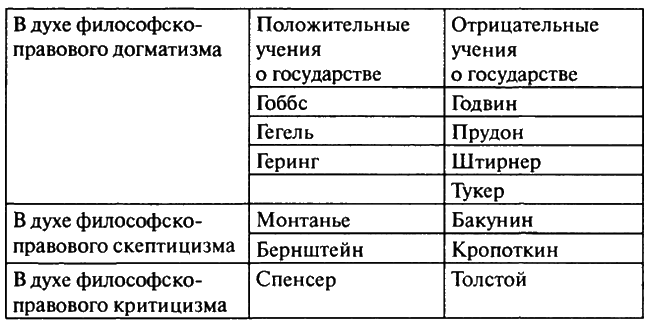 I. По своему отношению к государству, т. е. к тому правовому отношению, в силу которого в какой-нибудь области существует высшая власть, семь изложенных учений имеют нечто общее. 1. Они имеют то общее между собой, что отрицают государство для нашего будущего. Точнее этого нельзя определить то, что общего имеют друг с другом изложенные учения по отношению к государству, ибо отрицание государства для нашего будущего носит в них совершенно различный смысл. Отрицание государства для нашего будущего у Годвина, Штирнера, Тукера и Прудона означает то, что они устраняют государство безусловно, следовательно, и для нашего будущего; при этом Годвин устраняет его, потому что государство всегда и всюду вредит общему счастью; Штирнер же и Тукер — потому что оно вредит счастью отдельного человека, а Прудон — так как оно всюду и во все времена препятствовало справедливости. Отрицание государства означает у Толстого то, что он устраняет государство не безусловно, а только для нашего будущего, так как существование его противоречит любви более, чем его отрицание, и если не всегда и всюду, то по крайней мере при настоящих условиях государственной жизни. У Бакунина и Кропоткина, наконец, отрицание государства для нашего будущего имеет значение, как предвидение того, что прогресс развития в нашем будущем устранит государство; при этом Бакунин подразумевает здесь прогресс человечества от менее совершенного к возможно более совершенному существованию, Кропоткин же — прогресс от менее счастливой жизни к жизни возможно более счастливой. 2. В том, чтó утверждают они для нашего будущего в противоположность государству — и именно в том различном смысле, в котором они отрицают государство для нашего будущего, — семь изложенных учений не имеют между собой ничего общего. Одни из них утверждают для нашего будущего в противоположность государству дружеское сожительство людей в свободном правовом взаимоотношении, именно согласно той правовой норме, что договоры должны быть выполнены; эти учения могут быть названы федералистическими. Другие утверждают для нашего будущего в противоположность государству дружественное сожительство без всякого правового взаимоотношения, именно согласно тому закону, который они утверждают для нашего будущего в противоположность праву; эти учения можно назвать спонтанистическими. Федералистичны учения Прудона, Бакунина, Кропоткина и Тукера; спонтанистичны же — Годвина, Штирнера и Толстого. 3. Спонтанистические учения различаются между собой, в свою очередь, в том неправовом законе, который они утверждают в противоположность государству, как основание дружеского сожительства людей в нашем будущем. По Годвину, на место государства должно стать дружеское сожительство людей, которое основывается на том, что для каждого человека общее счастье есть закон. По Штирнеру, на место государства должно стать дружеское сожительство людей, которое основывается на том, что для каждого законом является его собственное счастье. По Толстому, на место государства должно стать дружеское сожительство людей, которое основывается на том, что закон каждого представляет любовь.II. Семь изложенных и признанных анархическими учений допускают сопоставление относительно того, что общего имеют они друг с другом в своем отношении к государс