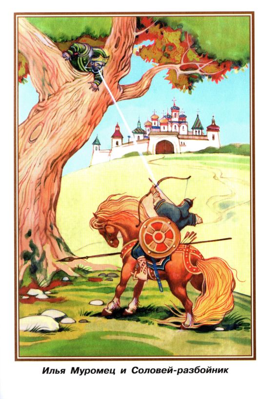 Раным-рано выехал Илья из Мурома, и хотелось ему к обеду попасть в стольный Киев-град. Его резвый конь поскакивает чуть пониже облака ходячего, повыше лесу стоячего. И скорым-скоро подъехал богатырь ко городу Чернигову. А под Черниговом стоит вражья сила несметная. Ни пешему проходу, ни конному проезду нет. Вражьи полчища ко крепостным стенам подбираются, помышляют Чернигов полонить-разорить. Подъехал Илья к несметной рати и принялся бить насильников-захватчиков, как траву косить. И мечом, и копьём, и тяжёлой палицей, [5] а конь богатырский топчет врагов. И вскорости прибил, притоптал ту силу вражью, великую. Отворялись ворота в крепостной стене, выходили черниговцы, богатырю низко кланялись и звали его воеводой в Чернигов-град. — За честь вам, мужики-черниговцы, спасибо, да не с руки мне воеводой сидеть в Чернигове, — отвечал Илья Муромец. — Тороплюсь я в стольный Киев-град. Укажите мне дорогу прямоезжую! — Избавитель ты наш, славный русский богатырь, заросла, замуравела прямоезжая дорога в Киев-град. Окольным путём теперь ходят пешие и ездят конные. Возле Чёрной Грязи, у реки Смородинки, поселился Соловей-разбойник, Одихмантьев сын. Сидит разбойник на двенадцати дубах. Свищет злодей по-соловьему, кричит по-звериному, и от посвиста соловьего да от крика звериного трава-мурава пожухла вся, лазоревые цветы осыпаются, тёмные леса к земле клонятся, а люди замертво лежат! Не езди той дорогой, славный богатырь! Не послушал Илья черниговцев, поехал дорогой прямоезжею. Подъезжает он к речке Смородинке да ко Грязи Чёрной. Приметил его Соловей-разбойник и стал свистать по-соловьему, закричал по-звериному, зашипел злодей по-змеиному. Пожухла трава, цветы осыпались, деревья к земле приклонились, конь под Ильёй спотыкаться стал. Рассердился богатырь, замахнулся на коня плёткой шелковой. — Что ты, волчья сыть, [6] травяной мешок, спотыкаться стал? Не слыхал, видно, посвисту соловьего, шипу змеиного да крику звериного? Сам схватил тугой лук разрывчатый и стрелял в Соловья-разбойника, поранил правый глаз да руку правую чудовища, и упал злодей на землю. Приторочил богатырь разбойника к седельной луке и повёз Соловья по чисту полю мимо логова соловьего. Увидали сыновья да дочери, как везут отца, привязана к седельной луке, схватили мечи да рогатины, побежали Соловья-разбойника выручать. А Илья их разметал, раскидал и, не мешкая, стал свой путь продолжать. Приехал Илья в стольный Киев-град, на широкий двор княжеский. А славный князь Владимир Красно Солнышко с князьями подколенными, [7] с боярами почётными да с богатырями могучими только что садились за обеденный стол. Илья поставил коня посреди двора, сам вошёл в палату столовую. Он крест клал по-писаному, поклонился на четыре стороны по-учёному, а самому князю великому во особицу. Стал князь Владимир выспрашивать: — Ты откуда, добрый молодец, как тебя по имени зовут, величают по отчеству? — Я из города Мурома, из пригородного села Карачарова, Илья Муромец. — Давно ли, добрый молодец, ты выехал из Мурома? — Рано утром выехал из Мурома, — отвечал Илья, — хотел было к обедне поспеть в Киев-град, да в дороге, в пути призамешкался. А ехал я дорогой прямоезжею мимо города Чернигова, мимо речки Смородинки да Чёрной Грязи. Насупился князь, нахмурился, глянул недобро: — Ты, мужик-деревенщина, в глаза над нами насмехаешься!