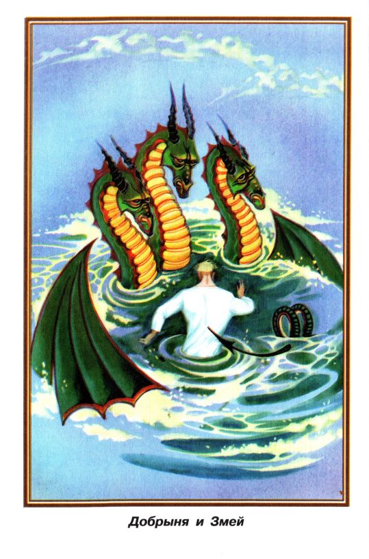 Возьму гусли звонкие, яровчатые [19] да настрою гусли на старинный лад, заведу старину стародавнюю, бывальщину о деяньях славнорусского богатыря Добрыни Никитича. В славном городе было, во Рязани, жил муж честной Никита Романович со своей верной женой Афимьей Александровной. И на радость отцу с матерью у них рос-подрастал единый сын, молодёшенький Добрыня Никитич. Вот жил Никита Романович девяносто лет, жил-поживал да и преставился. Овдовела Афимья Александровна, сиротой остался Добрыня шести годов. А семи годов посадила сына Афимья Александровна грамоту учить. И скорым-скоро грамота ему на пользу пошла: научился Добрыня бойко книги читать и орлиным пером того бойчее владеть. А двенадцати годов он на гуслях играл. На гуслях играл, песни складывал. Честная вдова Афимья Александровна на сына глядит, не нарадуется. Растёт Добрыня в плечах широк, тонок в поясе, брови чёрные вразлёт соболиные, глаза зоркие соколиные, кудри русые вьются кольцами, рассыпаются, с лица бел да румян, ровно маков цвет, а силой да ухваткой ему равных нет, и сам ласковый, обходительный.Добрыня и Змей