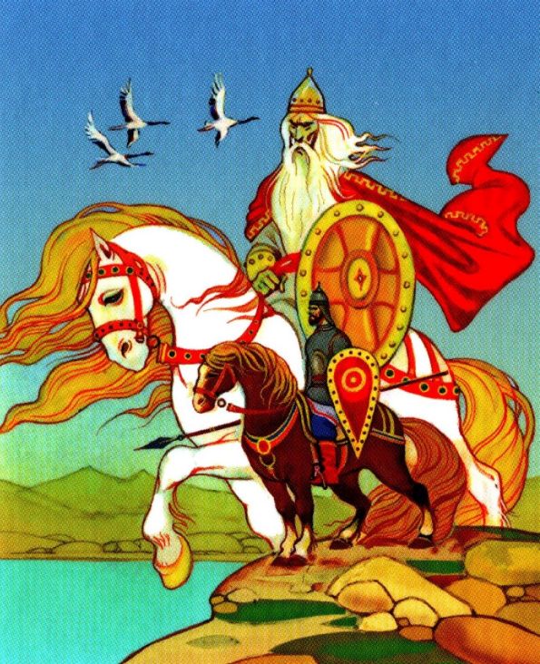 Жил богатырь на Святых горах. На могучем коне, как великая гора, ездил меж ущельев каменных. То был Святогор-богатырь. Ему сила-могута дана непомерная. Святогора да его коня богатырского не носила мать-сыра земля — вот и ездил он на каменных горах. Как-то спросил Святогор своего коня вещего: — Хочется мне на Руси побывать. Понесёт ли нас мать — сыра земля, коли спуститься с этих каменных гор? И проговорил конь речью человеческой: — Лёгкой поступью поедем — земля выдержит, а на грунь перейти либо скоком скакать — провалимся. И спустился Святогор с каменных гор, едет лёгкой поступью да и задремал на коне. И проехал он заставу богатырскую, а на заставе стояли тогда три богатыря: Илья Муромец с Добрыней Никитичем да Алёша Попович-млад. Заметили, усмотрели они следы Святогорова коня: из каждого копыта по печи земли вывернуто, смотреть на следы — страх берёт. Проговорил тут Илья Муромец: — Поеду-ка я, братья крестовые, по этим следам, поразведаю, коль не с добрым умыслом кто приехал, с нахвальщиком силой померяюсь, ведь в бою мне смерть не писана. Оседлал он своего бурушку-косматушку и поехал во чисто поле. Едет, коня понужает [32] и невдолге настиг-застал наездника. Видит — легко богатырский конь переступывает, по печи комья земли из копыт выворачивает, а на коне великан-богатырь сидит, сидя спит, похрапывает. Поближе подъехал Илья Муромец и зычным голосом окликнул раз, другой и третий наездника. Богатырь не оглянулся, не откликнулся, сидит на коне, сидя спит в седле да похрапывает. Илья Муромец подивился тому, подъехал к наезднику близко-наблизко да тупым концом долгомерного копья ударил по плечам наездника. А наездник сидит, спит в седле, не оглядывается, сидя спит да похрапывает. Удивился Илья Муромец, рассердился и ударил во всю силу богатырскую наездника в третий раз. После третьего удара оглянулся богатырь. Оглянулся, повернулся и вымолвил: — Думал, русские комарики покусывают, а тут богатырь Илья Муромец с долгомерным копьём тешится! Он нагнулся с седла, ухватил Илью Муромца вместе с конём одной рукой, поднял, оглядел и сунул в седельную суму. Ехал так час и другой. Святогоров конь спотыкаться стал, а под конец на коленки пал. Рассердился, закричал на коня Святогор: — Что ты, волчья сыть, травяной мешок, спотыкаешься, а под конец и на коленки пал? Чуешь, видно, беду-невзгоду над моей головой! Отвечал Святогоров конь: — Потому я спотыкаться стал, что вместо одного тебя несу на себе двух могучих богатырей да в придачу коня богатырского, а на коленки пал потому, что чую беду-невзгоду над твоей головой. Святогор-богатырь доставал Илью Муромца из седельной сумы, становил его с конём на землю и говорил таковы слова: — Будь ты, Илья Муромец, моим братом названым. Тебе в бою смерть не писана, а мне такая сила-могута дана, что худо носит нас с конём мать — сыра земля, оттого я живу да разъезжаю по каменным горам. По чистому полю, по широкому раздолью едут два богатыря: Илья Муромец, сын Иванович, да Святогор-богатырь. Едут, слышат, как орет в поле пахарь, понукивает, сошка у пахаря поскрипывает, омешики по камешкам прочиркивают, непомерные борозды оратай помётывает, из края уедет — другого не видать. Тут увидали Святогор с Ильёй возле пашни на обочине малую суму перемётную. Святогор-богатырь поддел за лямки сумочку на конец копья долгомерного, да не может сум
