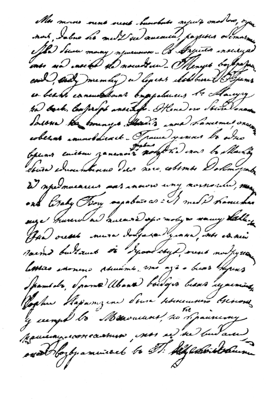 «Сентября 2-го 1838. Зачну свое письмо, любезная сестра, тысяча и тысяча извинениями, что так давно к тебе не писала. Но вот мои причины. Твое я получила в апреле месяце накануне отъезда нашего в Ярополец на свадьбу брата Ивана, про которую ты уже слышала. Описывать ее тебе не стану, потому что она произошла весьма тихим образом, кроме семейства наших и Мещерских чужих никого не было. Мари — умна, мила, хороша, добра — все, что можно желать для совершенного благополучия брата, мы с ней весьма подружились, и признаюсь тебе, что на тех братниных жен и смотреть не хочется после нее. Петр с женою[7] также были в Лотошино[8] в то время, и мы очень часто с ними виделись. Мы пробыли у матери около шести недель, в которое время были принуждены за болезнью Гриши[9] съездить в Москву, где прожили неделю; потом возвратились в Ярополец[10], а оттуда к 1 июню приехали сюда. В то время родила Сережина жена[11] дочь Марию. Брат просил убедительно сестру крестить маленькую. Мы, следственно, обратным образом поехали в Москву. Накануне нашего отъезда родила здесь жена[12] брата Дмитрия опять сына Дмитрия, уже 2-го. Мы прожили в Москве две недели. По возвращению нашем сюда нашли мы здесь мать, которая также приехала для крестин[13]. Дмитриева жена сделалась после родов опасно больна, мы целый день принуждены были бегать из дома в дом, ибо мать жила у них в белом замке[14] . Сей образ жизни продолжался месяц. Лизавета Егорьевна не оправлялась, мать не могла ехать. Наконец, стало ей полегче, мать уехала в Ярополец тому три дня. На другой день ее отъезда проводили мы также Сережу с женой и сыном, которые приезжали сюда к 27 августа[15], а вчера отправилась вся царская фамилия в Калугу, то есть Дмитрий с супругой и бельсер также, и наследник. Благоверной императрице советовали для совершенного поправления здоровья прожить месяц в столице. И так только теперь в уединении могли найти минуту свободную к тебе писать. Вот все мои резоны, присоединить ко всему общую нашу мать [нрзб.], и на этот щет больше ничего сказать не остается. Ты спрашиваешь в своем письме если Авдотья[16] угомонилась. Давно она в Петербурге принялась к какой-то Олениной, должно быть Annete. Может статься, что когда получишь мое письмо, она уже будет при тебе, то можешь ее поцеловать от меня. Говоря про Авдотью, я вспомнила, что еще не говорила тебе о свадьбе своей Матрены. Вот другая неделя, что она замужем за Вессарионом[17], который между протчем при нас вот уже год. Свадьба была превеликолепная. Благодари Сиркур за ее память; она мила что вспомнила об нас; на счет комиссий никаких пока не могу дать ей теперь кроме ватошного шлафора для зимы, ибо я больше ничего не наношу. А что дальше будет — Бог весть (оба раза подчеркнуто Александрой Николаевной. — С. Л.). Поцелуй ее, однако, от меня и скажи ей, что я ее также очень люблю. Ты спрашиваешь, что делают твои пансионерки, встречаю я их иногда на улице. Катя и Надя большие девки, но я думаю, что проку в них мало будет, ибо мать весьма вяла. На Святой неделе утонула их меньшая сестра в колодце, ты ее не знала, она родилась после нашего отъезда. Забыла тебе объявить еще свадьбу, но вероятно ты об ней уже слышала. Катенька Калечиц[18] идет за какого-то армейского офицера шведа (фамилия неразборчиво. — С. Л.). Она сама говорит, что он дурак, не очень умен и ничего не имеет, но, впрочем, добрый малый. Однако по