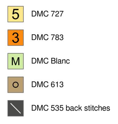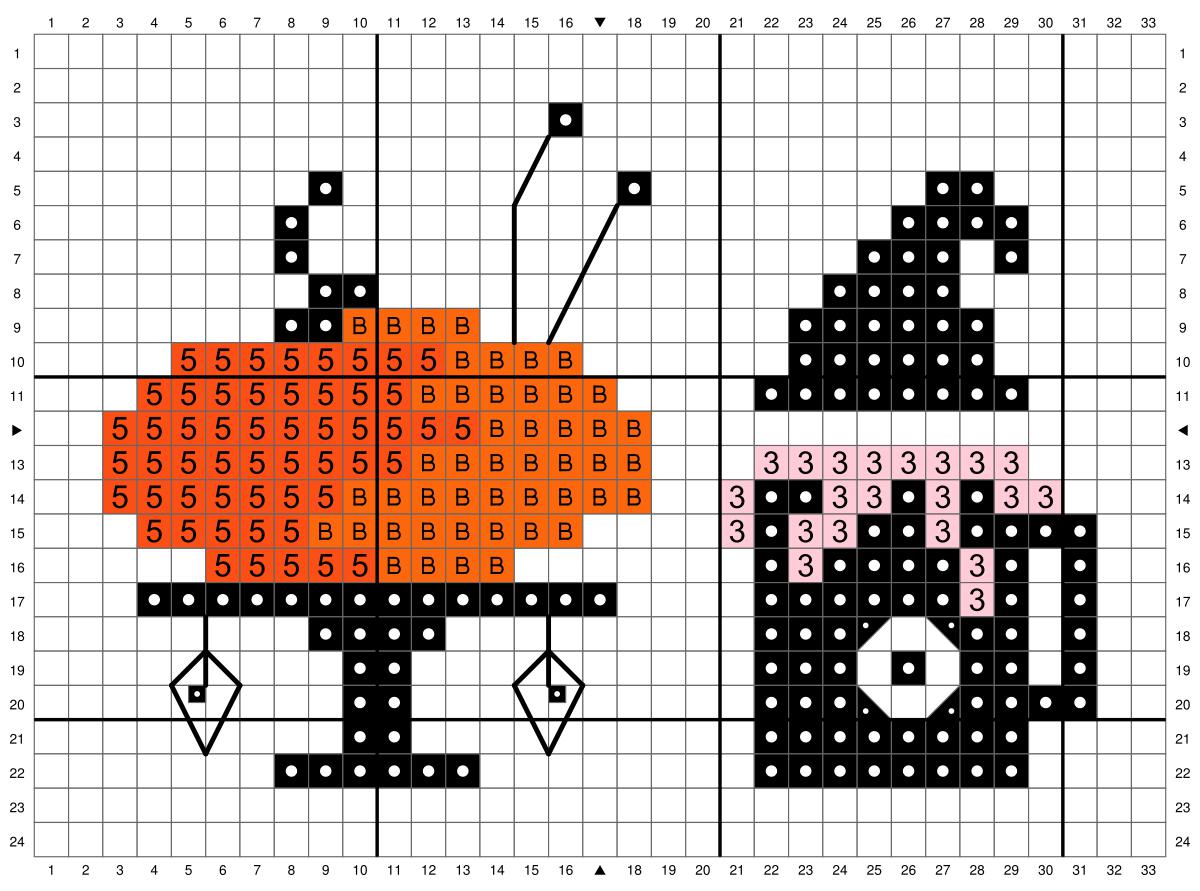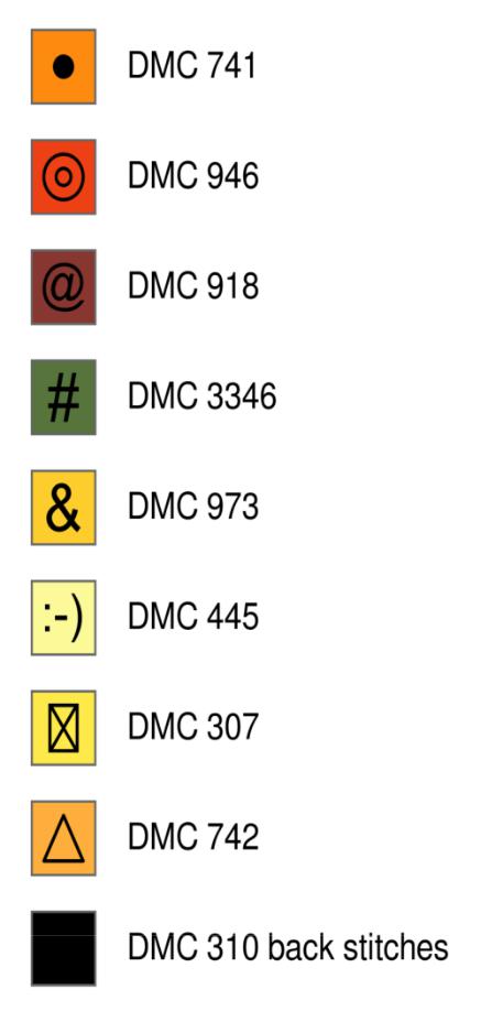 Back stitches — шов назад иголку. Черные линии на схеме — DMC 310; оранжевые линии на схеме — DMC 725.
