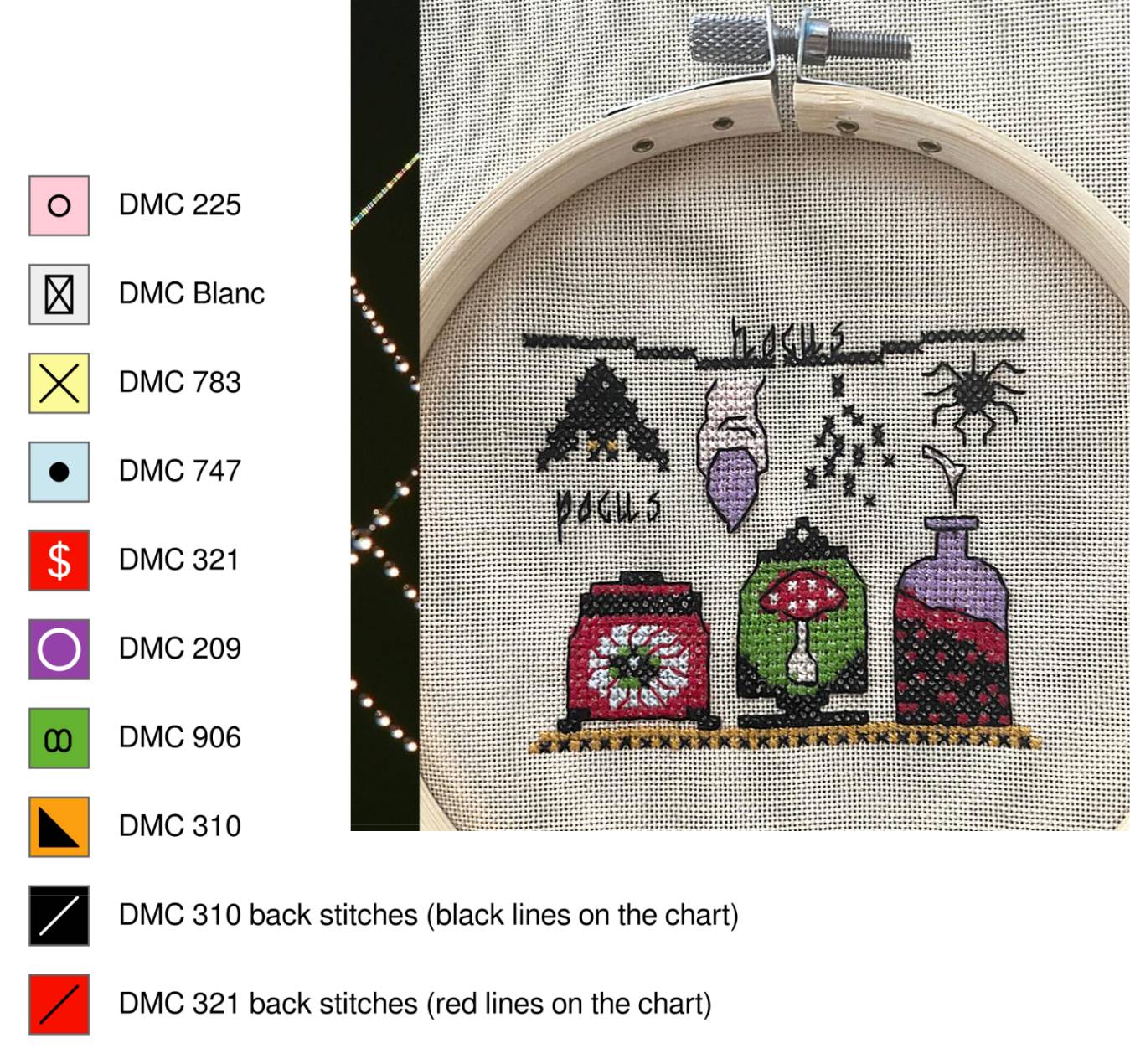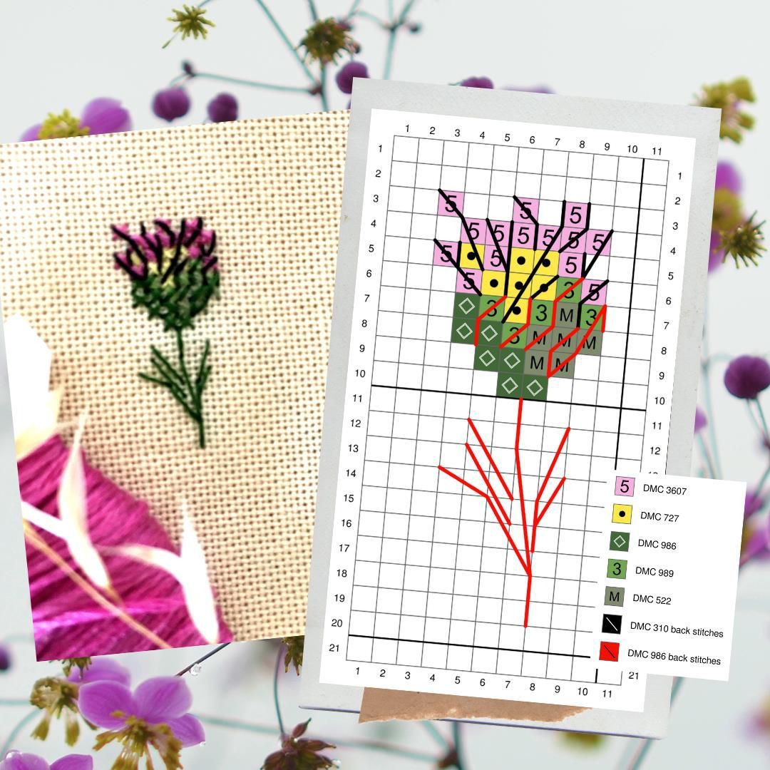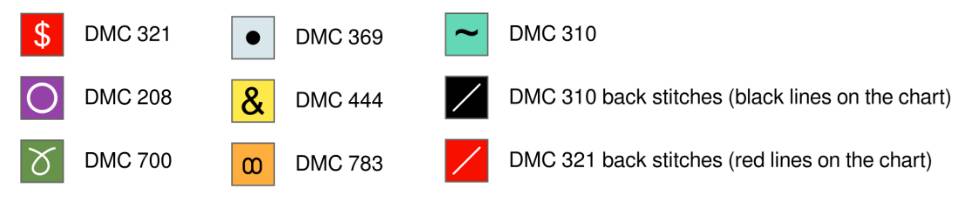 Back stitches — шов назад иголку. Красные линии на схеме — DMC 3046; фиолетовые линии на схеме — DMC 938; оранжевые линии на схеме — DMC 814; желтые линии на схеме — Blanc.