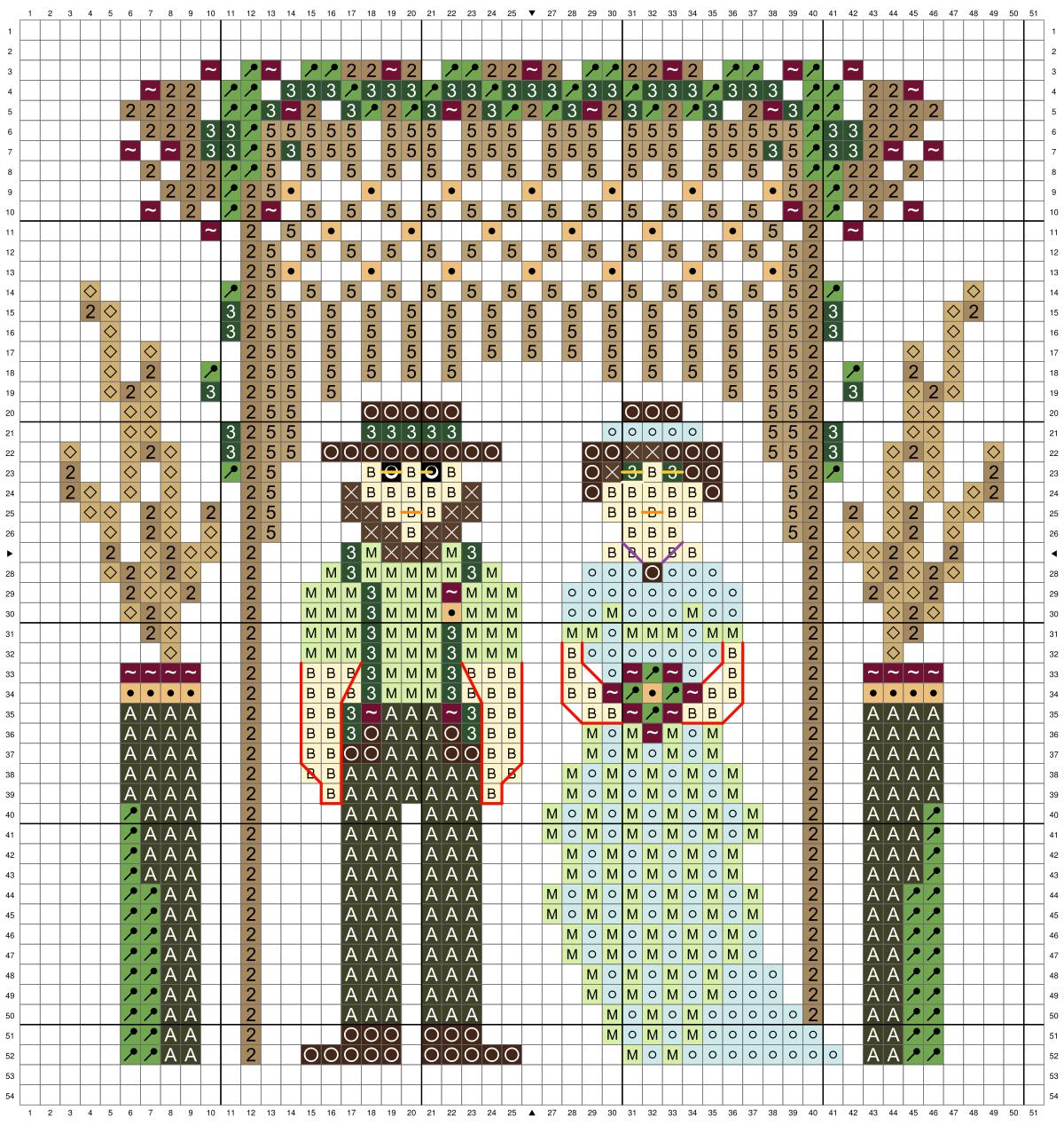 Back stitches — шов назад иголку. Коричневые линии на схеме — DMC 938; красные линии на схеме — DMC 801.