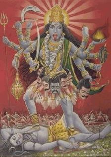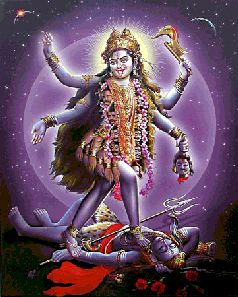 Есть еще одна причина, по которой необходимо стать перед Ма ребенком. Дети любят своих матерей, какими бы злыми или некрасивыми они ни были. Просто рассуждать о форме Ма — это одно, но увидеть Ее в действительности, с сочащейся кровью и с клыками, готовую поглотить вас, — совсем другое. Ваша реакция на Нее и определяет то, что Она может сделать для вас. Если вы не выражаете испуг, Она сделает для вас все, — просто из любви к вам. Если же вы реагируете со страхом или отвращением, Она станет еще более ужасной и страшной, и где вы тогда окажетесь? Кали и все Ее проявления — Смашан Тару, Чиннамасту, Багаламукхи и все другие формы — нельзя назвать плохими. Никто не хочет любить их, все боятся. Кали не может понять, почему все испытывают такой страх по отношению к Ней. Если вы любите Ее в достаточной мере, вы измените Ее природную разрушительность до такой степени, что исчезнет даже жажда крови. Люди считают Смашан Тару самой страшной богиней — и таковой Она и является. Одно из Ее имен — Бхаянкари, то есть «Вселяющая ужас». Но если вы подойдете к Ней с сердцем, полным любви как у Кришны, Она станет Радхой, величайшей возлюбленной Кришны. Если вы относитесь к Ней как к матери, Она и любит вас, как мать любит своего ребенка. Но если в вас нет веры в Ма, великую Богиню, и если вас постигает неудача, то вам ничего не остается, как рождаться снова и снова, пока вы не исправитесь. Вы можете подойти к изображению Ма и сказать Ей: «О Ма, как Ты прекрасна!» или: «Какой ужас!» — или что-то еще, но испытываемая вами эмоция является лишь реакцией на Ее внешнюю форму. Если вы хотите развить настоящие отношения с Ней, проникнуть внутрь Нее и достичь Ее внутренней сущности, вы должны знать какому существу вы поклоняетесь. Не зная Ее внутренней сути, как вы можете познать Ее? Но прежде, чем отправиться вглубь, вы должны вначале понять Ее внешнюю форму, ибо это на самом деле ваша внешняя форма. Атман, или Вселенская Душа — это солнце, а вы — отражение. Точно так же, как луна может отражаться сразу в тысячах водоемов, Атман может существовать в миллионах человеческих существ и оставаться при этом отстраненным, незатронутым. Большинство людей представляют собой несовершенные отражения, ибо они завязли в трех гунах, трех основных качествах существования. Если вода в озере взволнована, она не может верно передавать образ луны, но когда она спокойна, отражение совершенно. Когда вы видите Ма, вы смотрите на Нее через пелену, через завесу трех гун, поэтому вы и не можете с самого начала увидеть Ее в Ее истинной форме. Почему Она синего цвета? Вначале задайте этот вопрос, и когда вы поймете ответ на него, вы сможете понять и все остальное. Почему небо или море синее? Если вы наберете пригоршню морской воды, вы увидите, что она прозрачная, но море в целом имеет синий цвет. Воздух бесцветен, небо — нет. Это все оптический обман, а то, что вы видите Ма — или Кришну — в синем цвете, также является оптической иллюзией, ибо вы смотрите на них своими физическими глазами. Если бы вы могли видеть божественным глазом, вы бы увидели нечто иное. Но сейчас Смашан Тара для вас Шьяма — глубокого, сияющего темно-синего цвета.