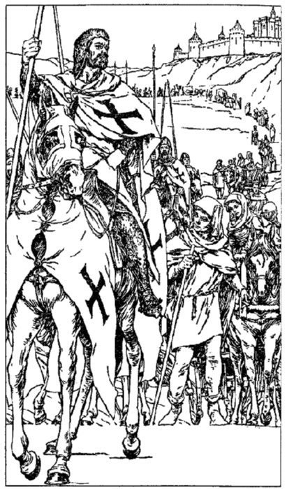 Упорный ветер, ночью поднявший волну, пришел с запада, а потому юнга с облюбованного Квинтом корабля, маленький арапчонок, с кожей цвета корицы, босой и почти голый, если не считать длинной желтой фуфайки да узкой головной повязки, спозаранку начал дубасить кулаками в дверь виллы и выкликать пассажиров. Как выяснилось, капитан уже закончил все дела в городе и не желал упускать попутный ветер, а стало быть, если Квинт и все прочие, кто купил себе места на палубе судна, не явятся в течение часа, якорь поднимут без них. Квинт и Уолт путешествовали налегке, в отличие от Тайлефера и его детей. Конь и мул менестреля все еще стояли в конюшне примерно в полумиле от дома Амаранты. За ними послали служанок: хотя Тайлефер не собирался брать животных с собой, он хотел навьючить на них чемоданы и сумки со всеми принадлежностями фокусника, арфу и прочие пожитки, иначе пришлось бы прибегнуть к услугам носильщиков, а те, почуяв спешку, запросили бы вдвое против обычной цены. Через полчаса коня и осла привели, еще пятнадцать минут ушло на то, чтобы взвалить им на спину добро Тайлефера и более-менее надежно его приторочить, после чего все чуть ли не бегом пустились по мощеным улочкам, разметая во все стороны очистки от овощей, которыми была усыпана дорога, и примчались в гавань с запасом по меньшей мере в пять минут. Поспели все, в том числе и Амаранта в сопровождении двух служанок. Ветер и впрямь разыгрался, он дергал за плащи и юбки, раздувал хлопавший, не закрепленный еще парус, и корабль даже здесь, в гавани, ощутимо раскачивался. Чайки кружили, опускались на борт, прежде чем умчаться на другую сторону гавани, поискать объедков у рыбачьего причала, где женщины уже потрошили и чистили рыбу после ночного лова. На корабле, отплывавшем в Святую Землю, и на нескольких соседних матросы изо всех сил тянули канаты, подымая паруса. За оконечностью мыса море, по контрасту с мчавшимися по нему белыми барашками, казалось почти черным. Тайлефер проследил за тем, как его скарб с помощью маленькой лебедки перегружают на палубу, и обратился к Амаранте: – Хочешь купить хорошую вьючную лошадь и мула? – Папочка! – хватая отца за руку, воскликнула Аделиза. – Ты мог бы и подарить их нашей милой хозяйке за ее гостеприимство. Амаранта улыбнулась. – Выставь их на аукцион, – предложила она, оглядев небольшую группу торговцев, разносчиков, грузчиков и просто зевак. Тайлефер послушался, и Амаранта, перебив все ставки, вручила ему три золотые монеты, которые вынула из особого кошелька ее старая служанка. – Это справедливая цена, – сказала она. – Хотя, конечно, я смогу получить кое-какую прибыль, если продам их на ярмарке. Наступил тот неловкий момент, который неизменно наступает при прощании: все слова уже сказаны, и непонятно, когда же отплывет корабль или двинется в путь караван. Тяжело было на сердце у Уолта, его точили сомнения, он бесцельно бродил по набережной, сам с собою рассуждая о предстоящем путешествии. Его томил не только страх перед морской могилой, но и внезапно нахлынувшая тоска по дому, по родному очагу. Услышав английскую речь, он обернулся к морю и увидел внизу маленькое суденышко с открытой палубой, скорее даже ладью, разве что посредине кораблик был немного шире, чем знакомые Уолту длинные боевые суда, да корма и нос немного повыше. Но все равно он был впятеро меньше 