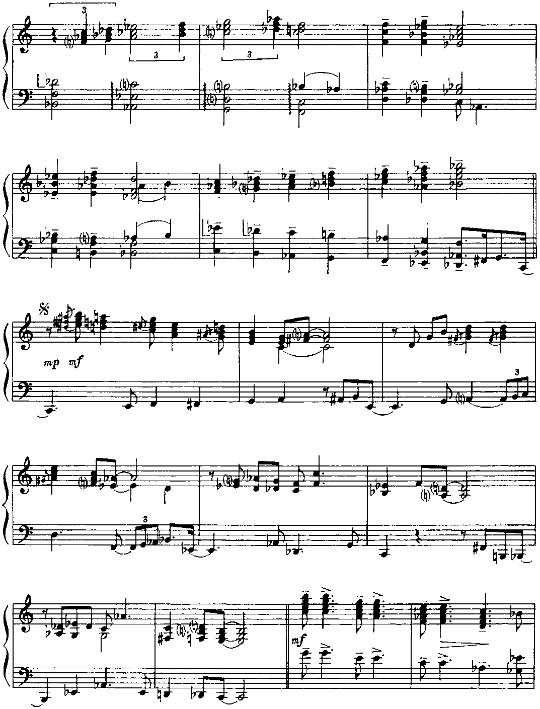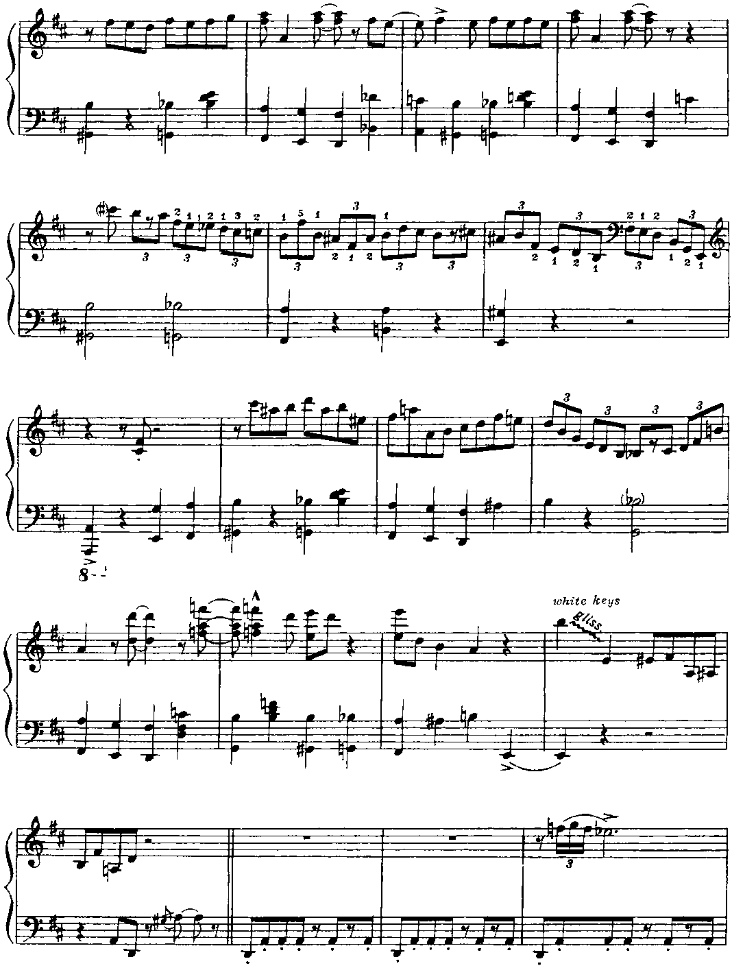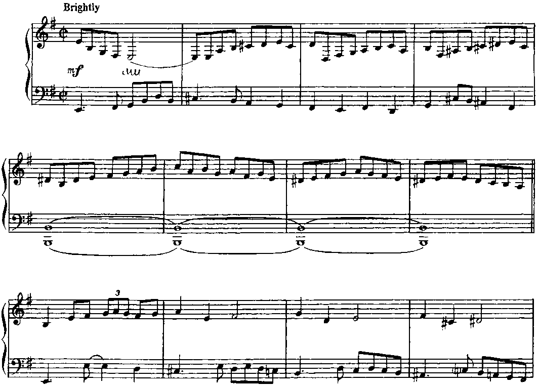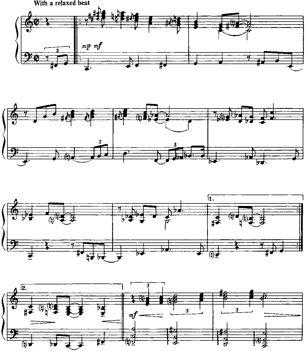 Для того чтобы должным образом ощущалась метрическая пульсация, имеет смысл представить себе, что в исполнении участвует ритм-группа. Полифоничность изложения требует особого внимания к мелодической линии каждого голоса. В "бридже” некоторые аккорды выпущены; это продиктовано, во-первых, соображениями удобоисполнимости и, во-вторых, стремлением обеспечить большую ясность артикуляции. (Примеч. автора.) Структура пьесы — интродукция (8 т.) + ААВА (8+8+8+8 т.) + интермедия на тоническом органном пункте (12 т.) + А (8 т.) + кода (9 т.). "Бридж” (восьмитакт В формы ААВА) контрастирует полифоническому окружению не только в интонационногармоническом аспекте, но и с точки зрения фактуры: он изложен так называемыми блок-аккордами (правая рука дублирует мелодию левой руки октавой выше и, кроме того, заполняет образующиеся октавные промежутки аккордовыми тонами; однако в ряде случаев такие октавно-аккордовые дублировки отсутствуют — это обстоятельство отражено в приведенном выше авторском пояснении). И еще — небольшой лингвистический комментарий. Английское идиоматическое выражение "Get off my back” означает "Отвяжи(те)сь от меня" (буквально — ”от моей спины"), "Оставь(те) меня в покое", "Отстань(те) от меня", "Не приставай(тс) ко мне”, "Не трогай(те) меня" и т. п. Фамилия великого немецкого полифониста звучит (привожу фонетическую транскрипцию) [bah], в англо-американском произношении — [ba:h] или же [ba:k], то есть очень похоже на слово back [bask] (разница лишь в окраске гласного звука). Таким образом, в названии этой пьесы (напоминающей бахов-ские двухголосные инвенции и относящейся к стилю baroque jazz — "джаз-барокко") Дж. Ширинг пользуется игрой слов; он как бы говорит: "Да не трогайте же вы моего Баха (как я его понимаю), оставьте его в покое — и меня заодно". Поначалу я хотел было остановиться на таком варианте перевода: "Отстаньте от меня и от моего Баха" (может быть, так и надо было сделать). Важно, что знаменитый слепой пианист и композитор (англичанин, подолгу живший в США), по всей вероятности, хотел подчеркнуть свое право на творческое преломление традиций И. С. Баха в русле джазовой стилистики. (Примеч. ред.-сост.)
