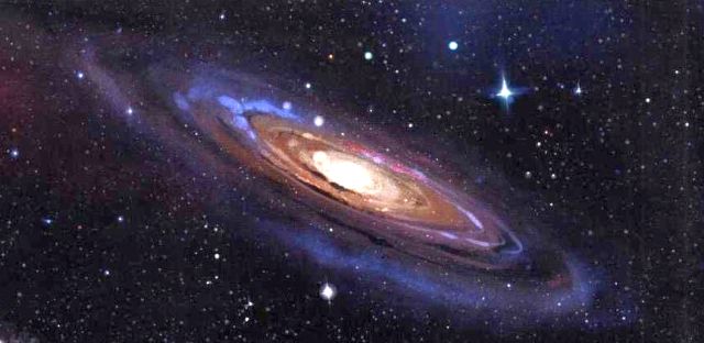 Мне очень жаль, но я не могу показать фотографии нашей Галактики, потому что пока нет ни одного такого снимка. Из окна своего дома ты никогда не сможешь сфотографировать весь свой дом! Чтобы это сделать, нужно выйти из дома, отойти от него, выбрать подходящее для фотографирования место. Только тогда у тебя получится фотография всего дома. Но как «выйти» из Галактики, из огромного звёздного дома, в котором мы живём? Земляне научились улетать за пределы своей планеты. Давно запущенные с Земли автоматические межпланетные станции уже находятся от Солнца дальше, чем Плутон, и ещё долго будут лететь к границам Солнечной системы. А за пределы Галактики посланцы землян если и полетят, то очень нескоро. Неужели до тех пор мы не узнаем, как выглядит наша Галактика? Уже узнали! Астрономы хорошо изучили устройство нашей Галактики и нашли во Вселенной много других галактик, похожих на неё. Ещё раз напомню, что слово «Галактика» относится только к нашему звёздному дому, а «галактика» — ко всем остальным, которых сейчас известно уже миллионы и даже миллиарды! Перед тобой портрет одной из них. Надо сказать, что такие изображения галактики удаётся получить только с помощью больших телескопов, без которых увидеть и сфотографировать далёкие галактики невозможно.