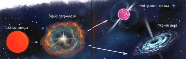 Если бы великан захотел превратить Солнце в чёрную дыру, ему пришлось бы сжать огромное Солнце в небольшой шар — размером «всего лишь» несколько километров… Великан мог бы изготавливать чёрные дыры и другим способом, складывая в разных частях Вселенной множество проживших свою жизнь звёзд, планет и другого космического материала. В результате у него могли бы получиться чёрные дыры, причём очень-очень тяжёлые. Ты, конечно, понимаешь, что придумать можно любого великана и его фантастические проделки. А что же происходит на самом деле? Как во Вселенной рождаются чёрные дыры? Поговорим об этом подробнее.