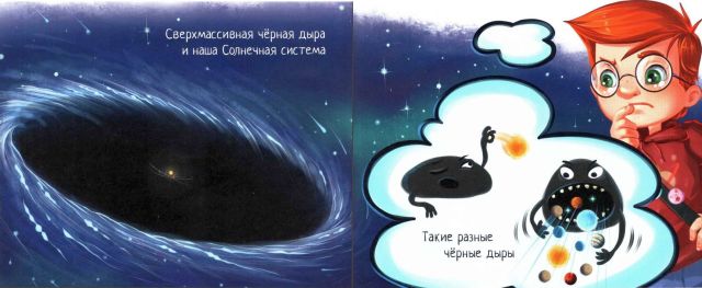 Это означает, что в центре Галактики не множество тяжёлых звёзд, а громадная чёрная дыра, которая весит примерно как четыре миллиона звёзд, подобных Солнцу. Такие чёрные дыры называются сверхмассивными. Уже насчитывается несколько сотен галактик, в ядрах которых почти наверняка есть сверхмассивные чёрные дыры. Напомню, что звёздные чёрные дыры, с которыми я тебя уже познакомил, очень небольшие, размером всего несколько километров, то есть во много раз меньше, чем, скажем, Луна. Размеры сверхмассивных чёрных дыр совсем другие. Например, сверхмассивная чёрная дыра в нашей Галактике так велика, что, наверное, не поместилась бы в Солнечной системе. К счастью, «характер» чёрной дыры в нашей Галактике довольно спокойный. Она дремлет, лениво пожирая то, что на неё упадёт, питаясь в основном неосторожными звёздами и газом, которого много в пространстве между звёздами. Хорошо, что наша сверхмассивная чёрная дыра не буйствует, как её сёстры в активных галактиках. Можно сказать, что мы живём в нормальной галактике и сверхмассивная чёрная дыра у нас тоже нормальная, а не жуткий монстр. Это просто замечательно!