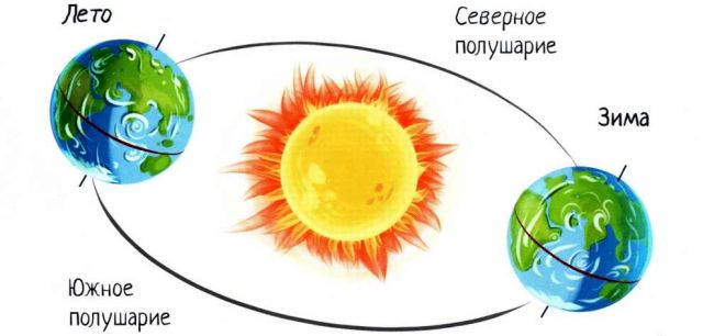 Земной шар только кажется неподвижным. На самом деле он вращается вокруг своей оси, делая полный оборот за 24 часа (или за одни сутки). Мы не замечаем вращения Земли, но видим, как восходят и заходят небесные светила — Солнце, Луна, звёзды. Вращаясь вокруг оси, Земля поворачивается к Солнцу то одной, то другой стороной, благодаря чему у нас происходит смена дня и ночи. За один год Земля успевает сделать оборот вокруг Солнца. Ось Земли наклонена, и в течение года Солнце по-разному освещает Северное и Южное полушария Земли. Поэтому на Земле происходит смена времён года: лето сменяется осенью, осень — зимой, зима — весной, весна — летом.