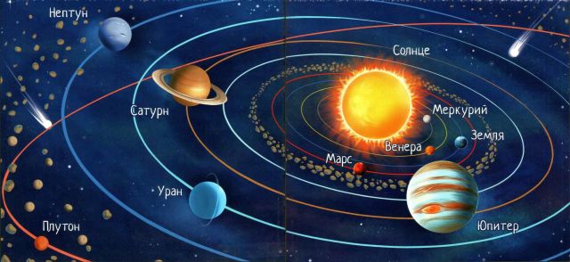 Есть в Солнечной системе и крошечные планетки — астероиды. Они располагаются в основном между Марсом и Юпитером. Кроме планет и астероидов вокруг Солнца движутся кометы, которые, приближаясь к Солнцу, становятся похожими на хвостатые звёзды. К настоящим звёздам кометы никакого отношения не имеют, потому что в отличие от этих небольших ледяных глыб с длинными хвостами из газа и пыли звёзды представляют собой большие раскалённые шары. В Солнечной системе есть лишь одна звезда — Солнце. Оно освещает и обогревает Землю и другие планеты.