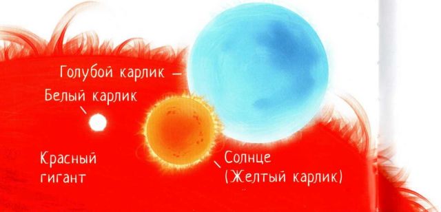 Но астрономы уже сегодня знают, что ожидает Солнце через миллиарды лет. Оно из жёлтой звёзды, размеры которой не так уж велики по сравнению с гораздо большими звёздами — гигантами и сверхгигантами, превратится в красную звезду-гиганта. В дальнейшем оболочка красного гиганта начнёт медленно отделяться от расположенного в его центре сжавшегося ядра. Удалившись от ядра, эта оболочка превратится в красивую туманность. Астрономы сфотографировали немало таких туманностей. Эти туманности почти круглой формы, и называют их планетарными. Одна из них — перед тобой. Когда почти такая же туманность отделится от нашего разбухшего Солнца, на месте красного гиганта останется горячий белый карлик размером с Землю. Белых карликов уже много открыто в нашей Галактике. Вещество белого карлика очень необычное. Если бы мы могли наполнить им чайную ложку и взвесить её на Земле, то она весила бы около тонны!