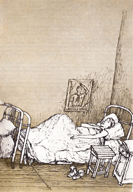 Так они спорили, а Леня недвижимо лежал в своей проклятущей кровати. И спорили от души — любой бы пионерский сбор позавидовал. В ход шли выражения самого высокого класса, например: «совесть отряда», «честь лагеря». Но при этом все произносилось шелестящим шепотом. И только руками можно было размахивать сколько хочешь. Такие картинки бывают в телевизоре, когда надоест его слушать и ты выключаешь звук.